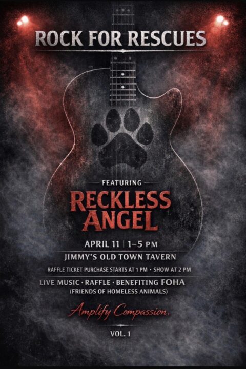 Join Reckless Angel for an afternoon of rock at Jimmy’s Old Town Tavern — all while raising money for FOHA (Friends of Homeless Animals).