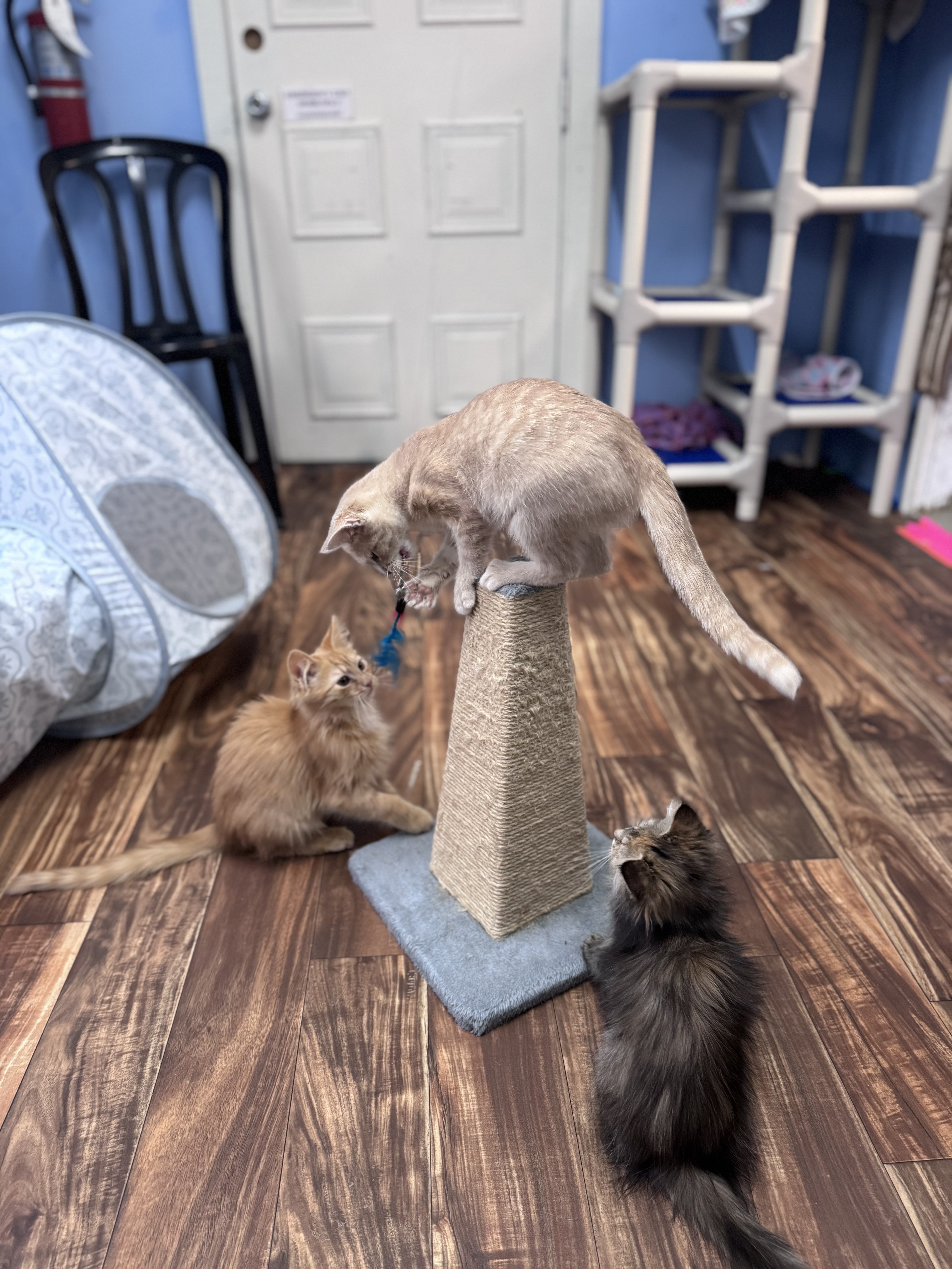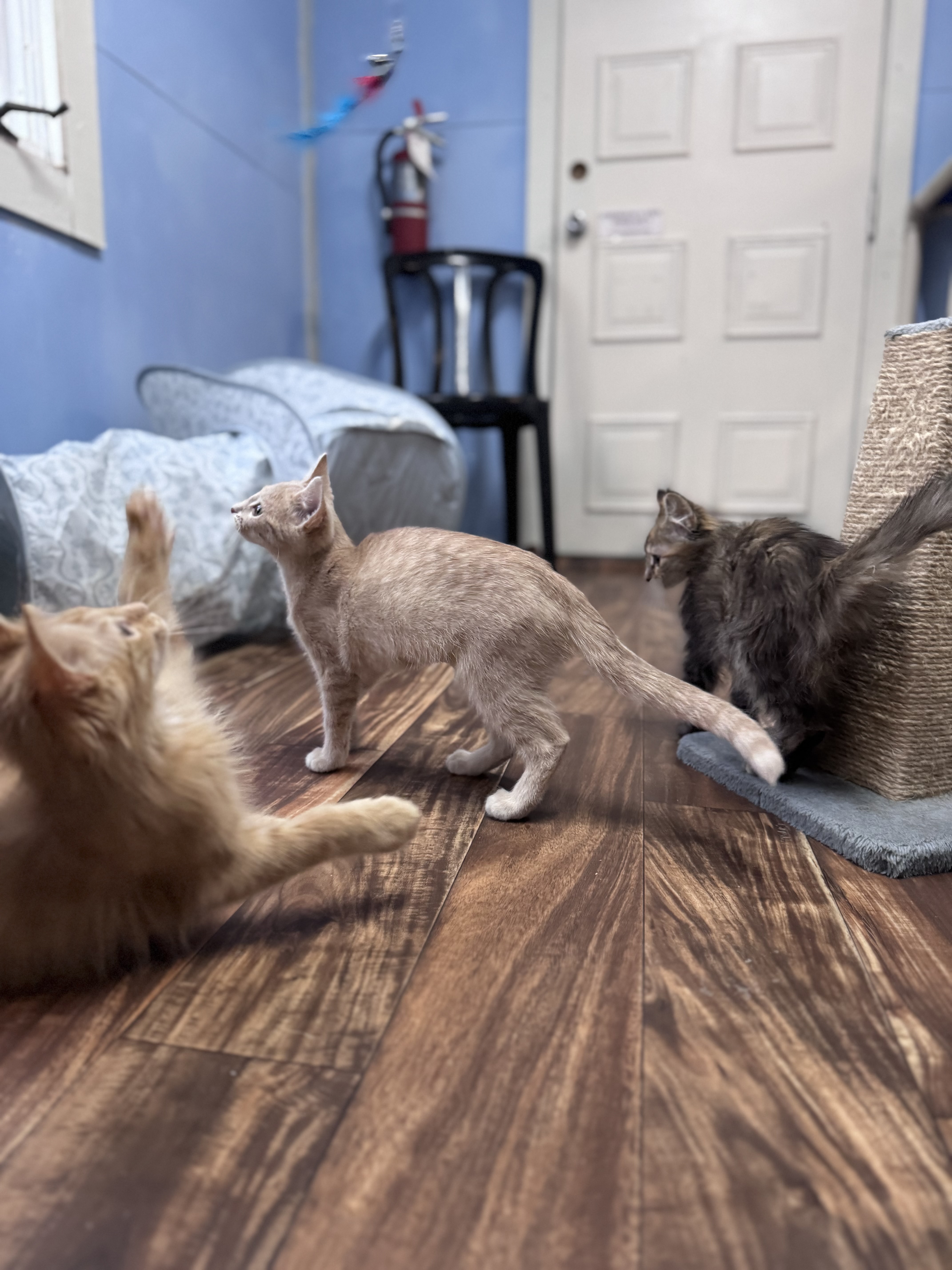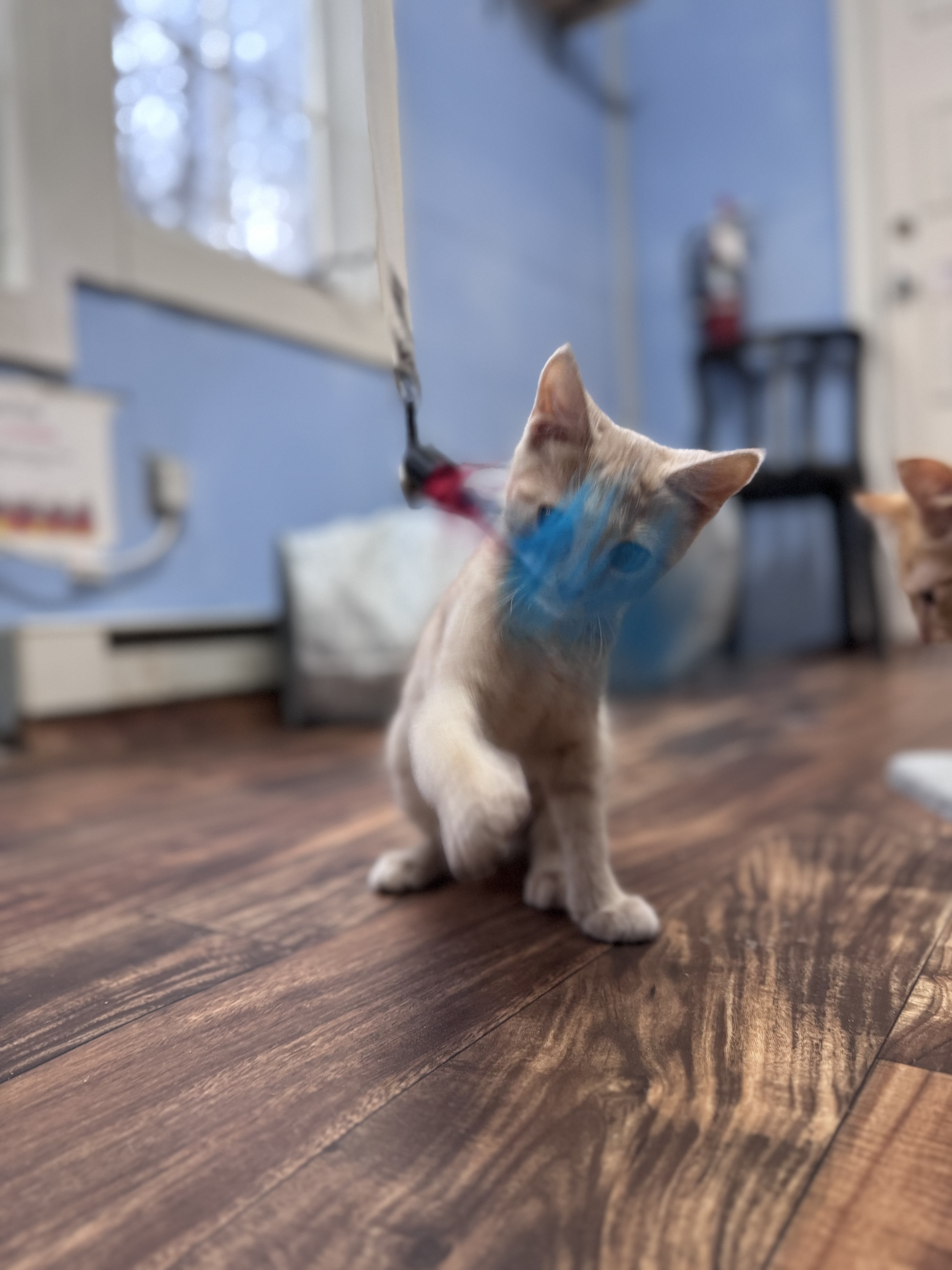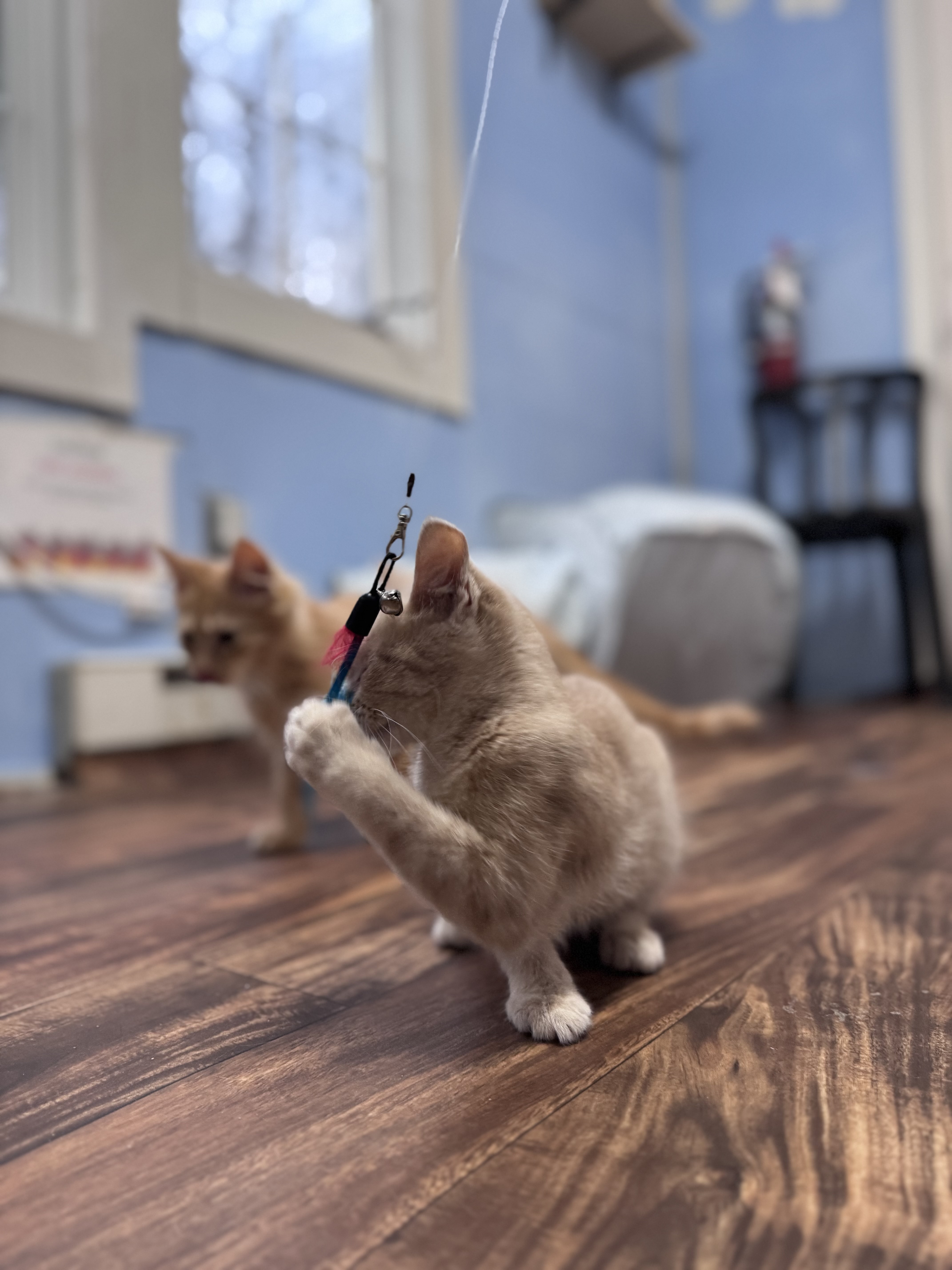 I do best with a social cat companion! Kittens under 6 months old at FOHA are required to go home with another kitten or to a home with another social cat. This is prime time for me to learn everything it means to be a cat.