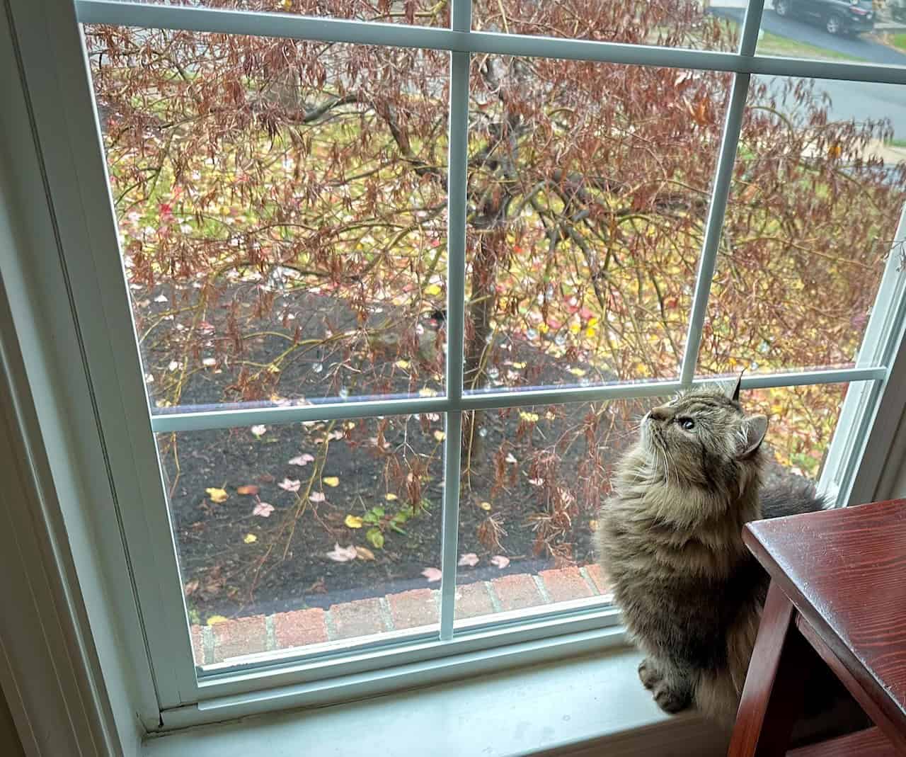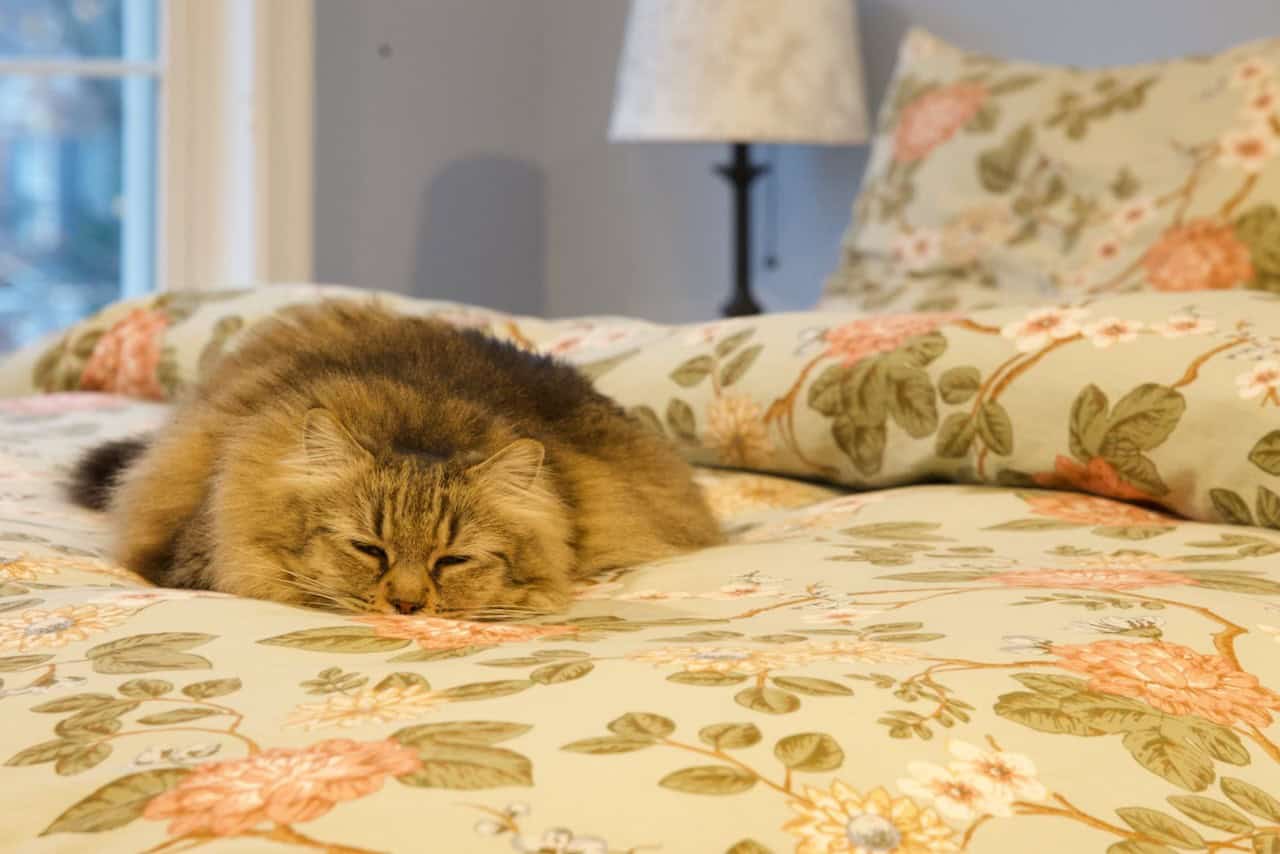 During the day, Bette Boo naps in her bed and checks in every few hours by walking from room to room. She vocalizes as she moves, offering soft commentary while she follows her person through the house. In the evening, she seeks closer contact. At bedtime, she gently paws at your arm to be lifted under the covers, where she sleeps pressed alongside you for the night.