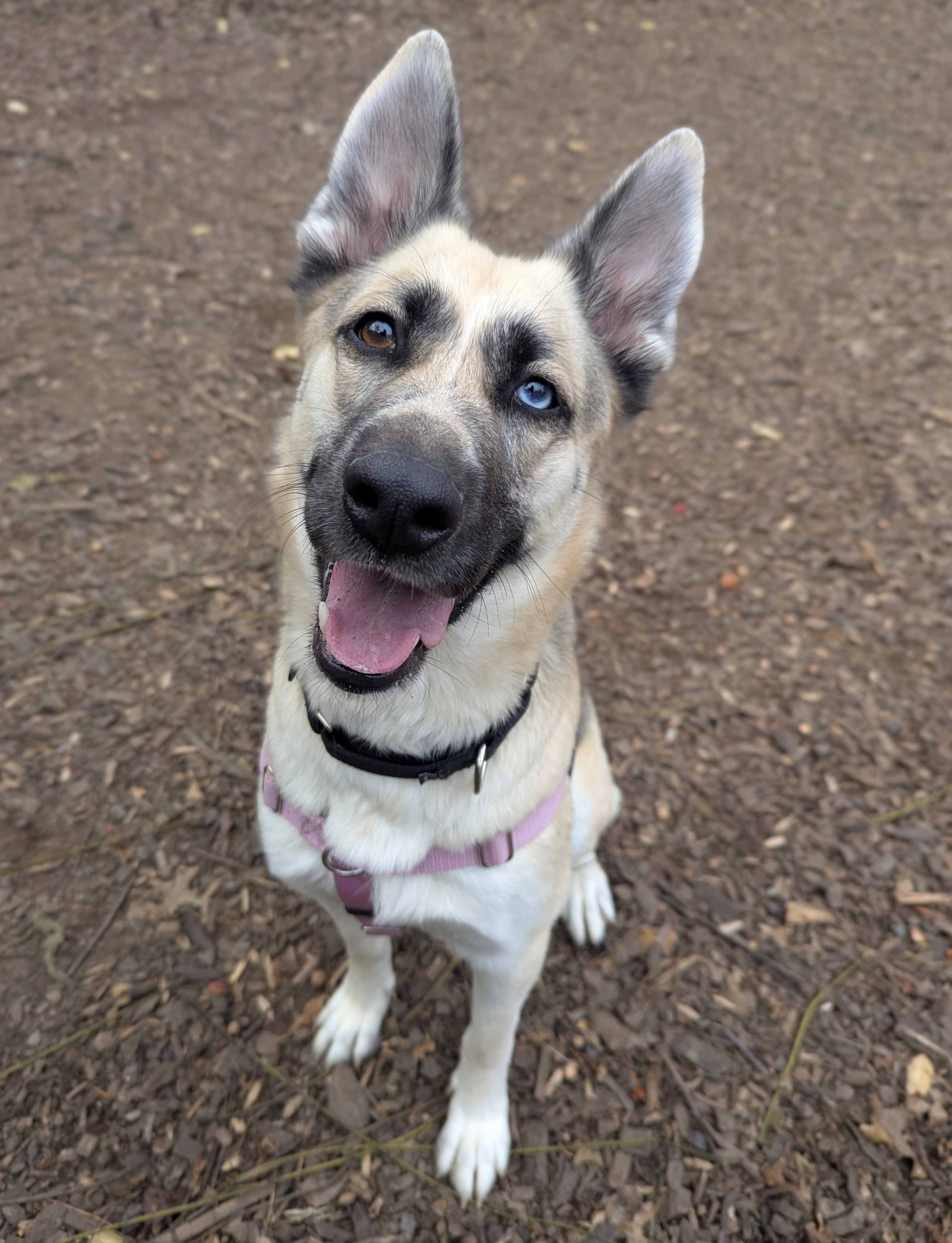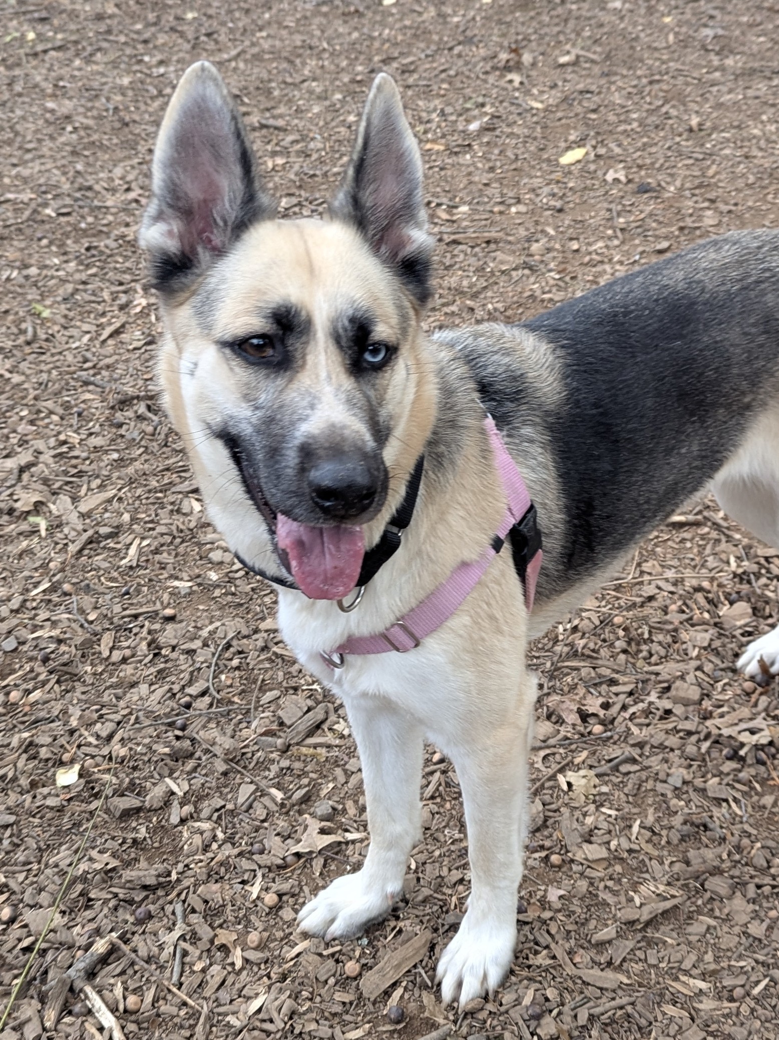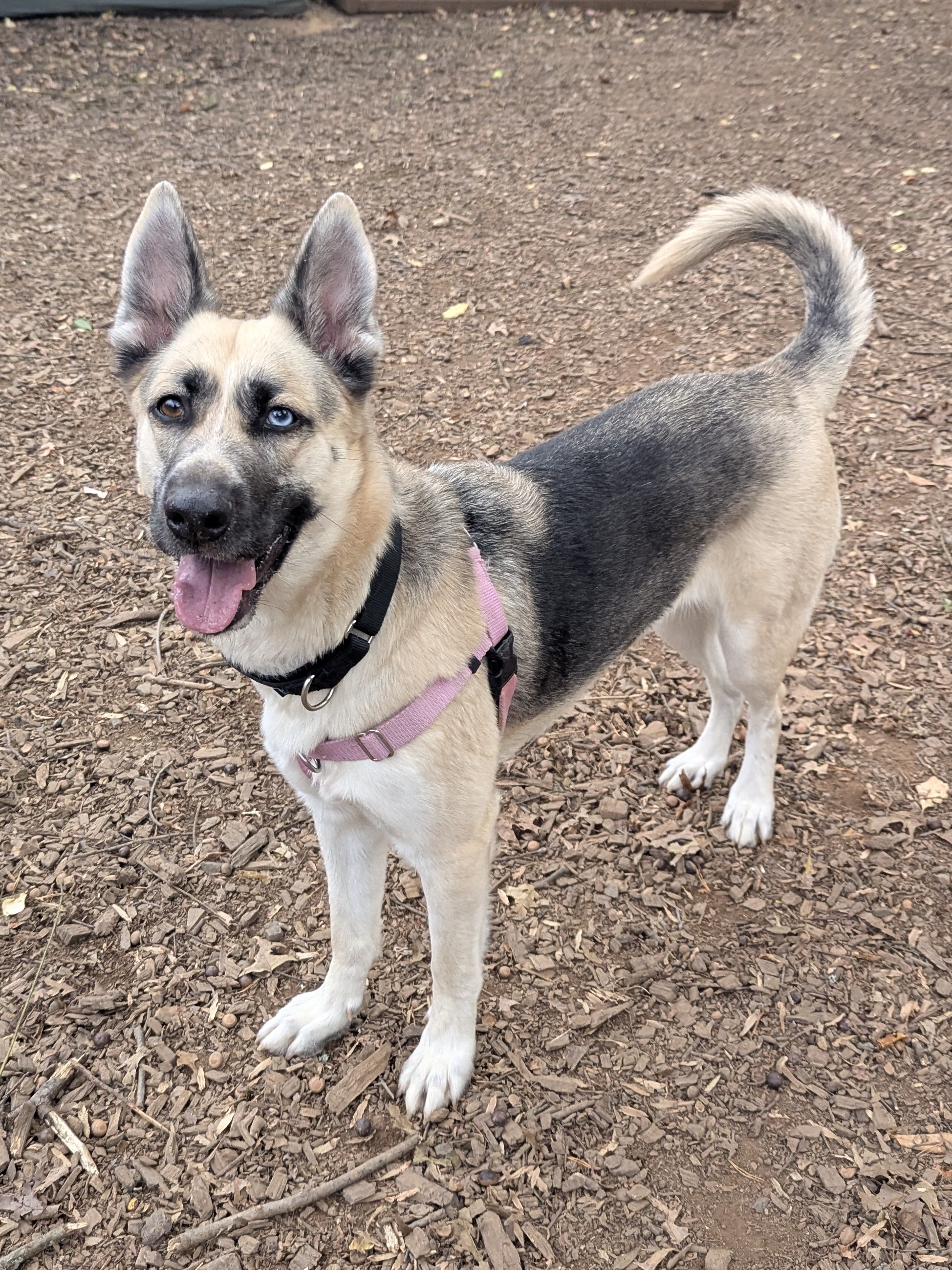 Bonnie is smart, energetic, athletic, and very loyal. She enjoys toys of all kinds and has done well playing with other dogs. She learns quickly, especially when high-value treats are involved. She’s housebroken and has done well in the home environment without being crated. After so much sleeping on the hard ground, she really loves snuggling on beds and couches with her person. Bonnie can pull on leash and gets excited when she sees dogs, but she is improving with a new harness and patient guidance. She does have a high prey drive, so no cats or other small pets in the home. Bonnie warms up to new people with slow introductions and settles comfortably once she feels safe.