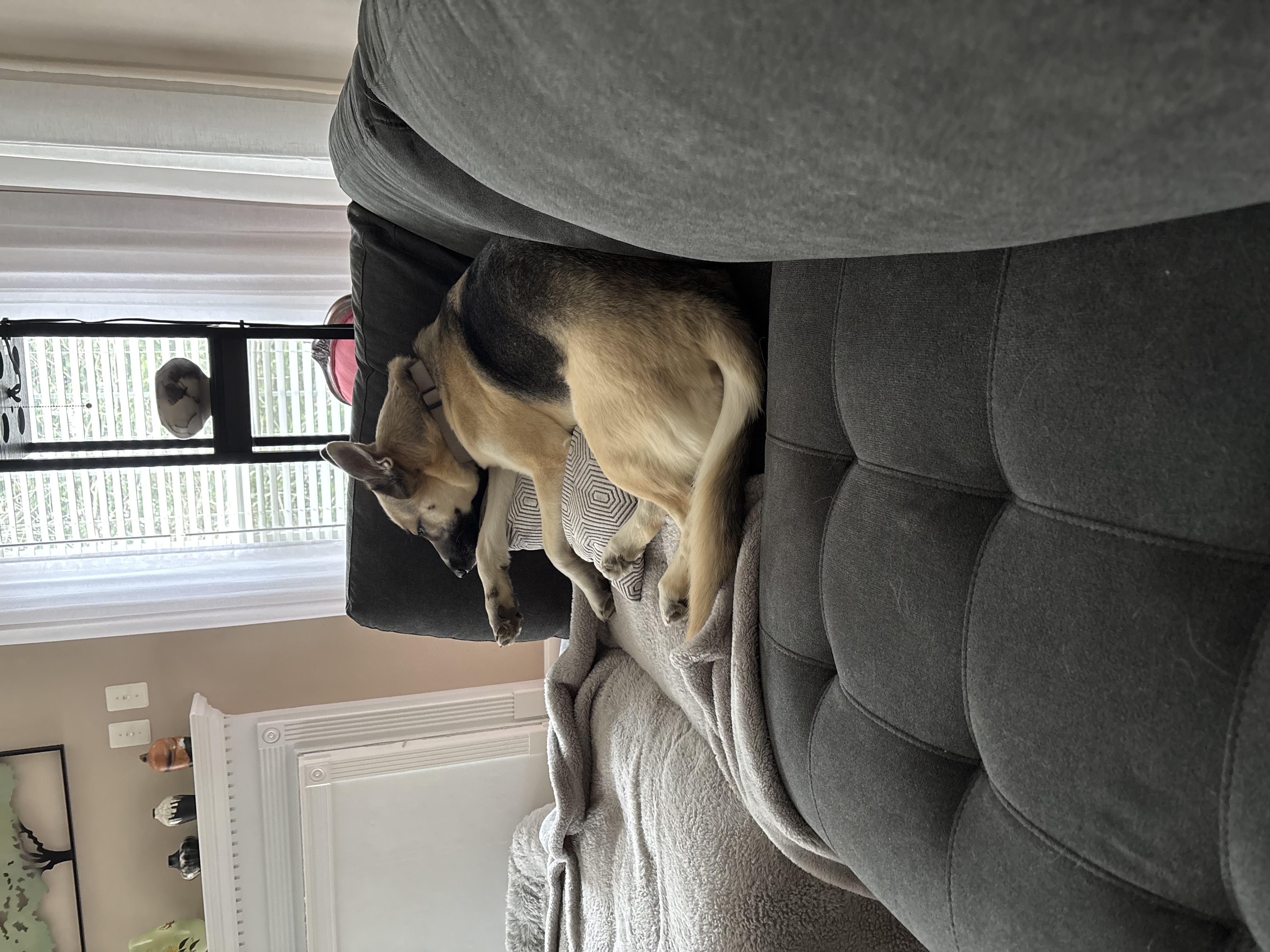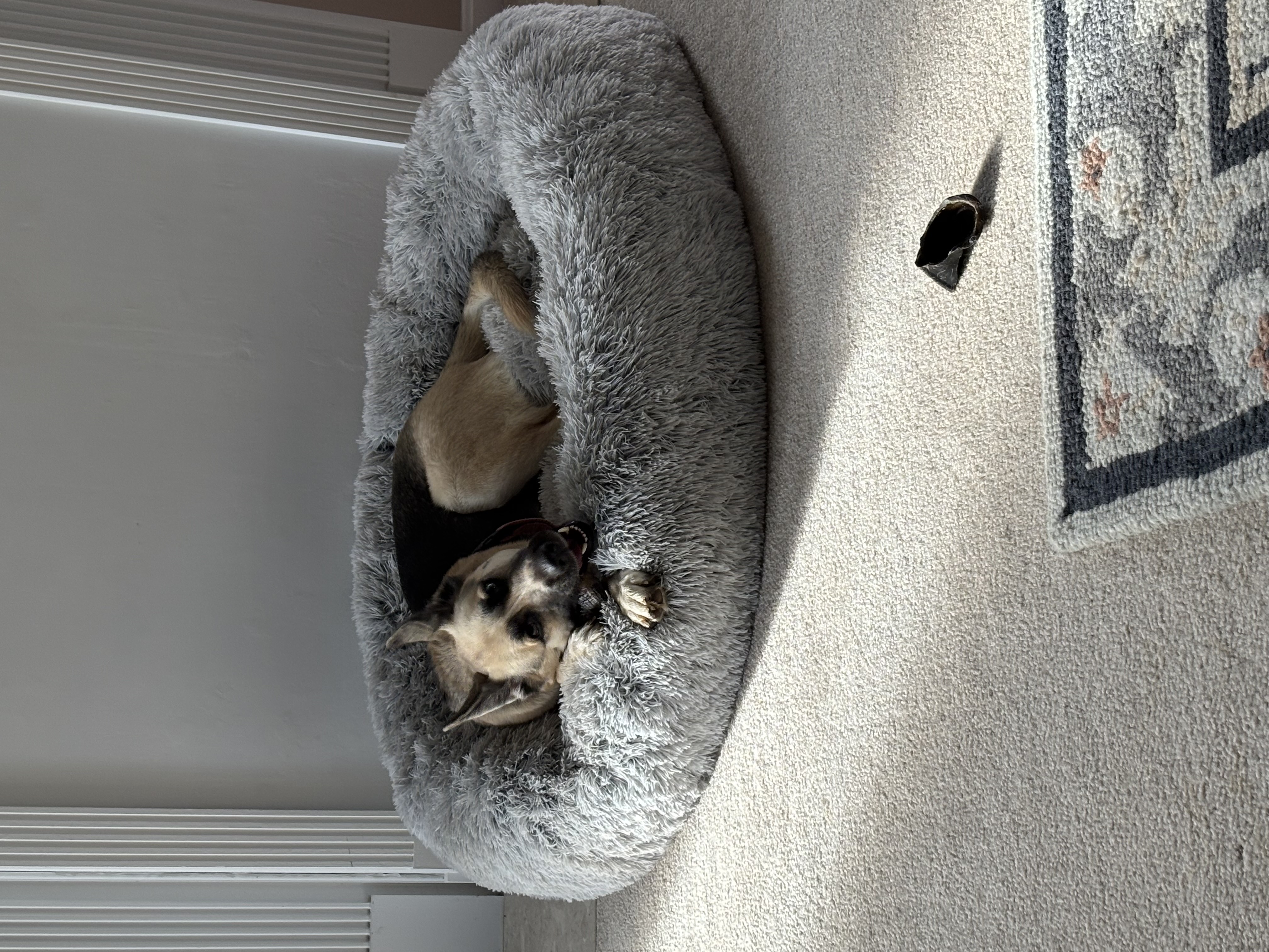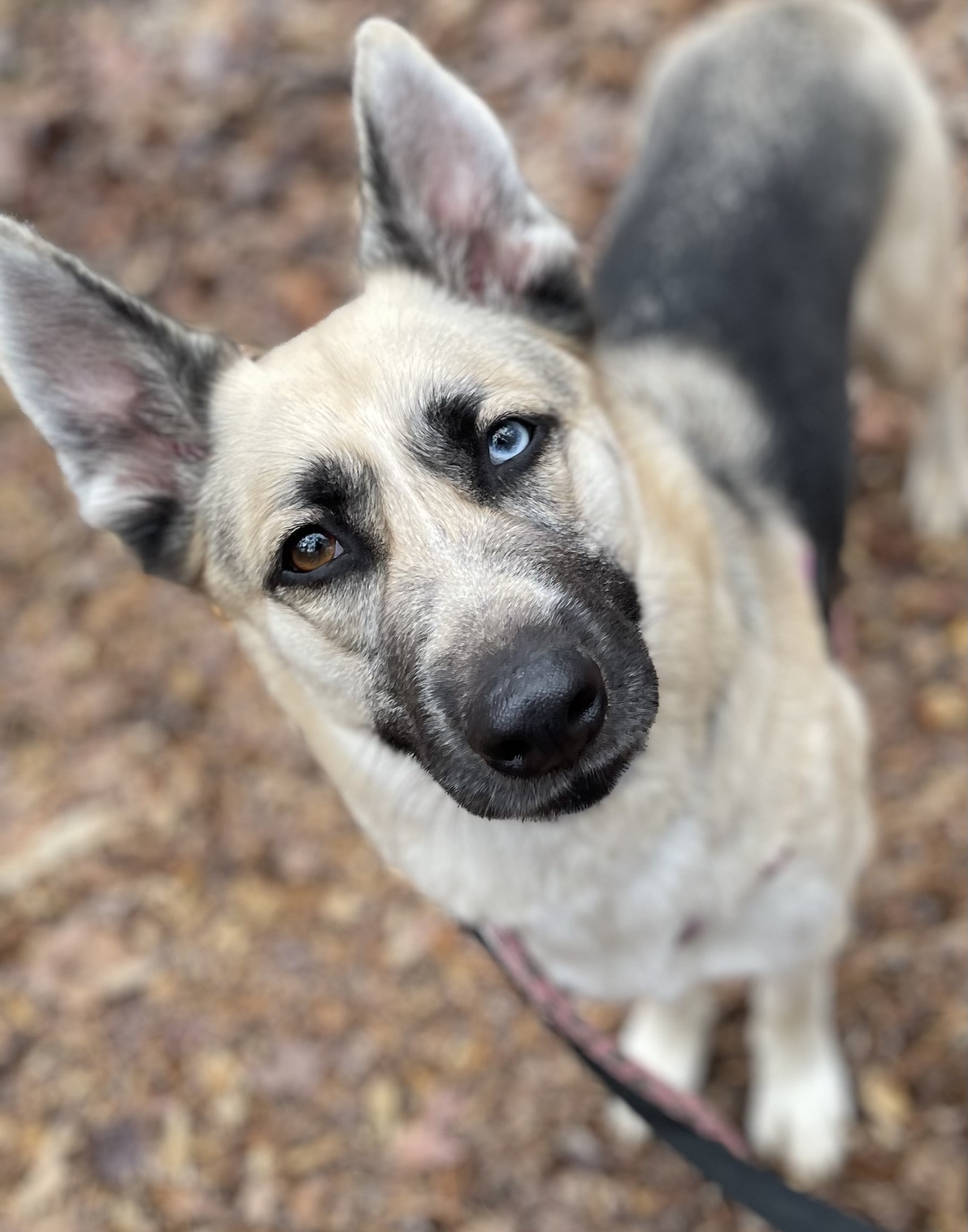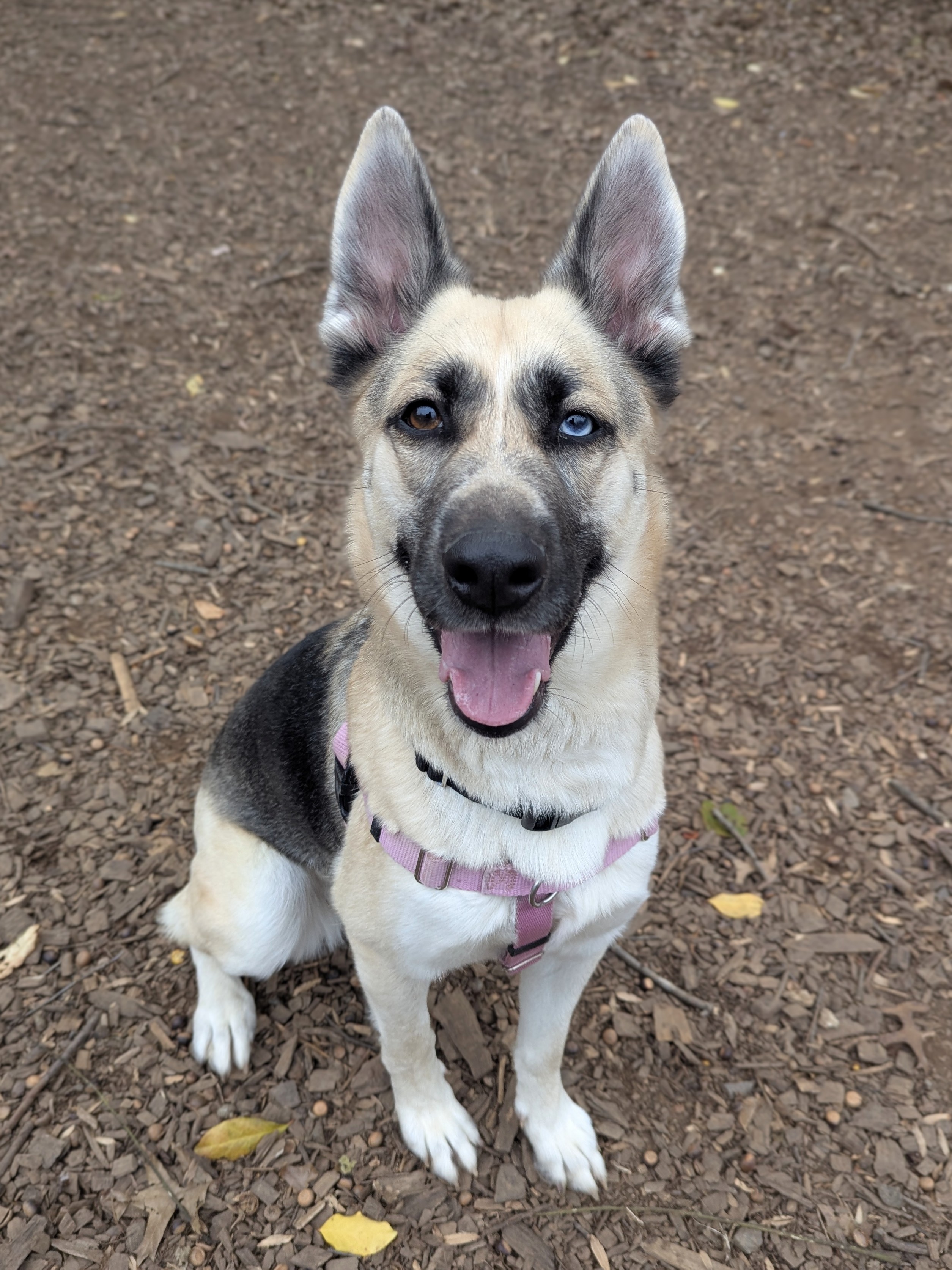Bonnie is smart, energetic, athletic, and very loyal. She enjoys toys of all kinds and has done well playing with other dogs. She learns quickly, especially when high-value treats are involved. She’s housebroken and has done well in the home environment without being crated. After so much sleeping on the hard ground, she really loves snuggling on beds and couches with her person. Bonnie can pull on leash and gets excited when she sees dogs, but she is improving with a new harness and patient guidance. She does have a high prey drive, so no cats or other small pets in the home. Bonnie warms up to new people with slow introductions and settles comfortably once she feels safe.