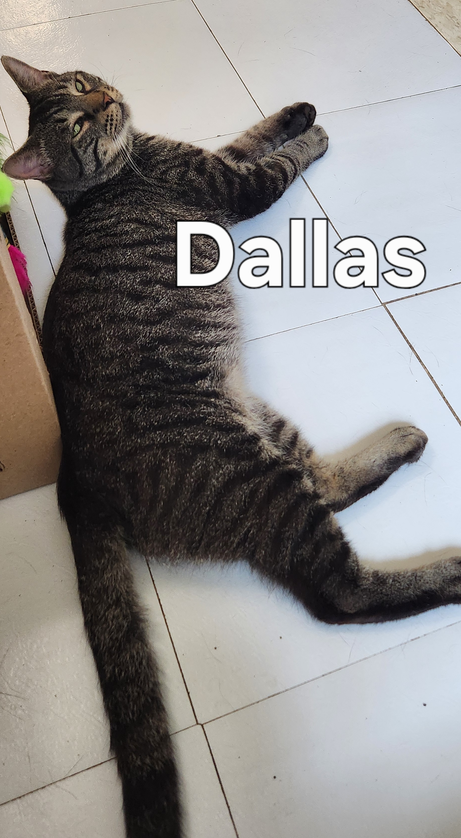 Hi, I’m Dallas, a handsome grey tabby with a heart as soft as my fur. If you’re looking for a loving, chatty, all-around great cat, I might just be your guy! I’m affectionate, social, and have a natural charm that makes everyone feel welcome. Volunteers say I’m a cutie pie who will curl up in your lap, make biscuits, and happily soak up all the pets you want to give. Sometimes I’m playful and silly with wand toys, and other times I’m ready for a snuggle or a good snooze by your side.