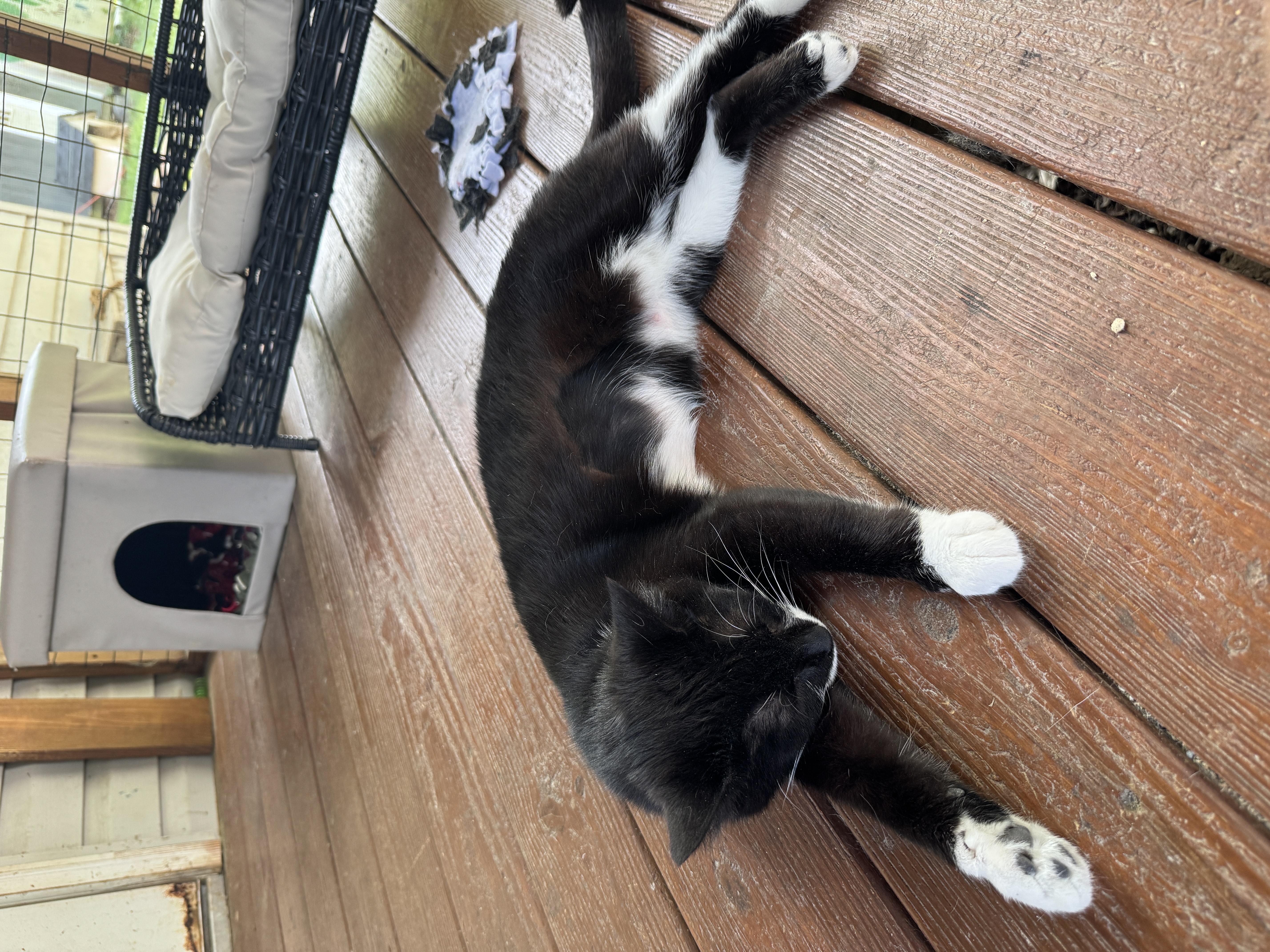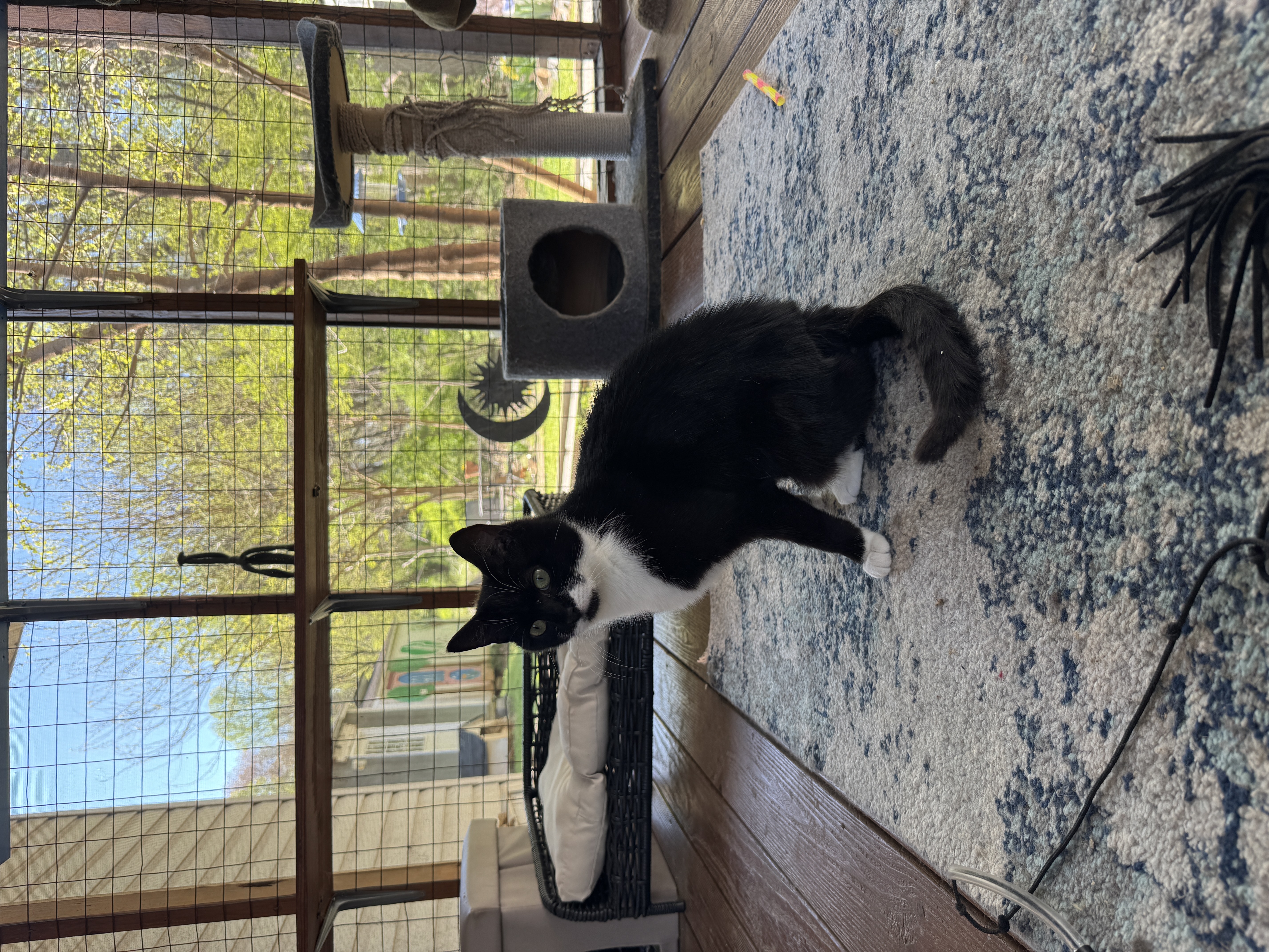 Relaxing in elevated spots, gentle pets, peaceful exploring, and soaking up calm affection from kind humans.