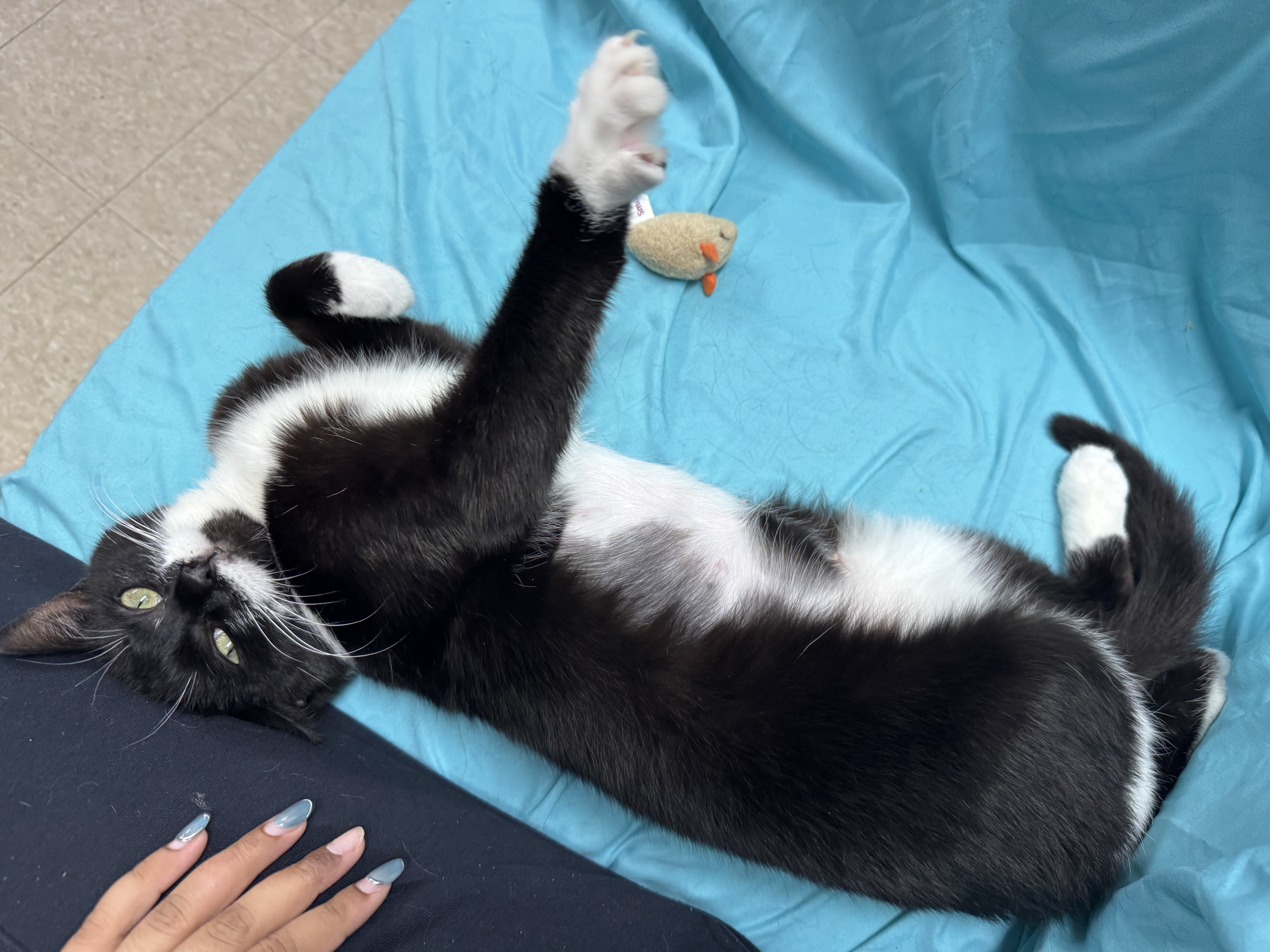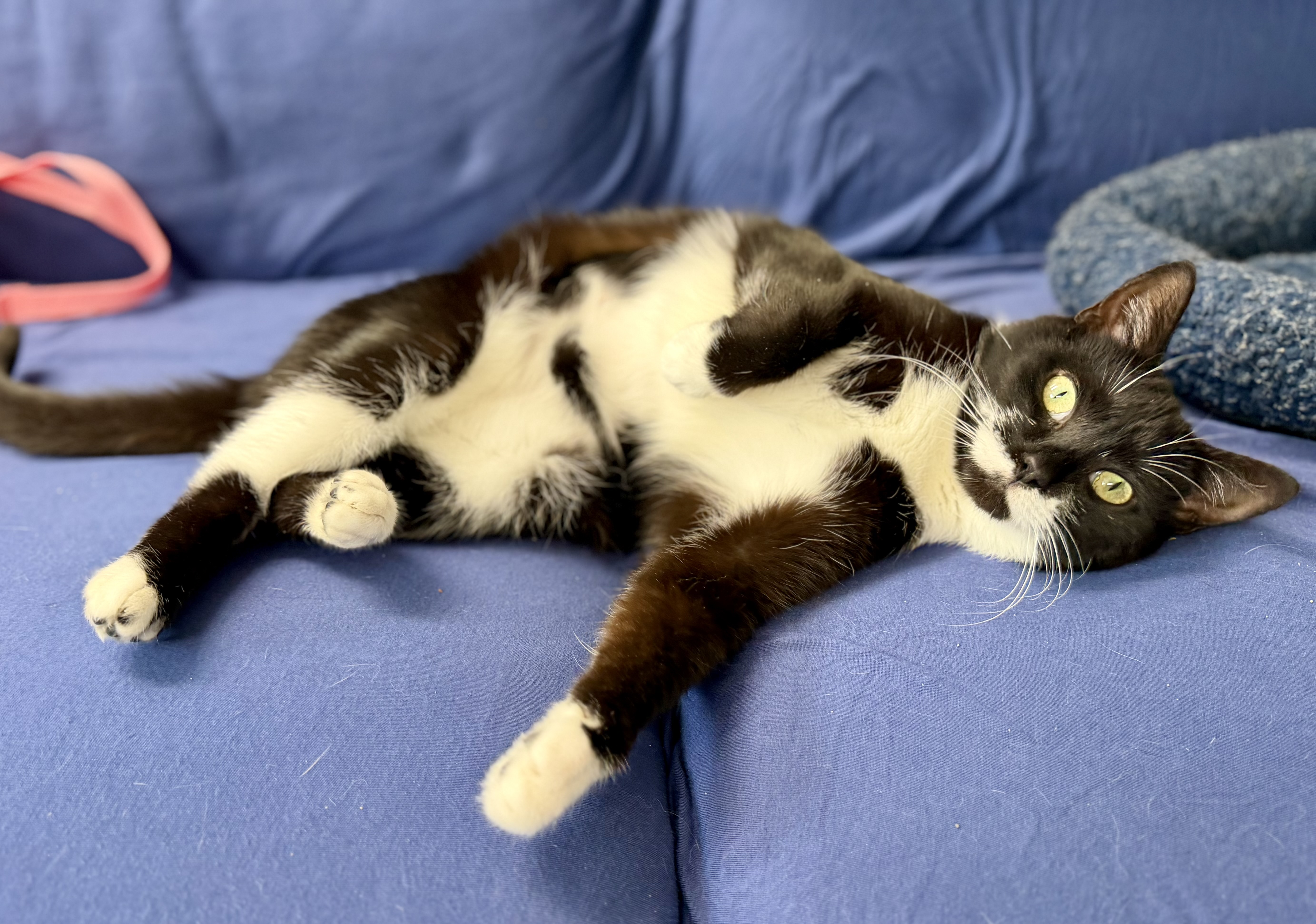 This pretty girl is gentle, observant, and quietly affectionate. She enjoys perching up high where she can take in the room and feel safe while watching the world go by. It doesn’t take long, though, for her sweet personality to shine — with just a little gentle petting, Daphne will happily roll onto her side and ask for more attention. She has a soft, trusting nature that makes spending time with her feel extra special.