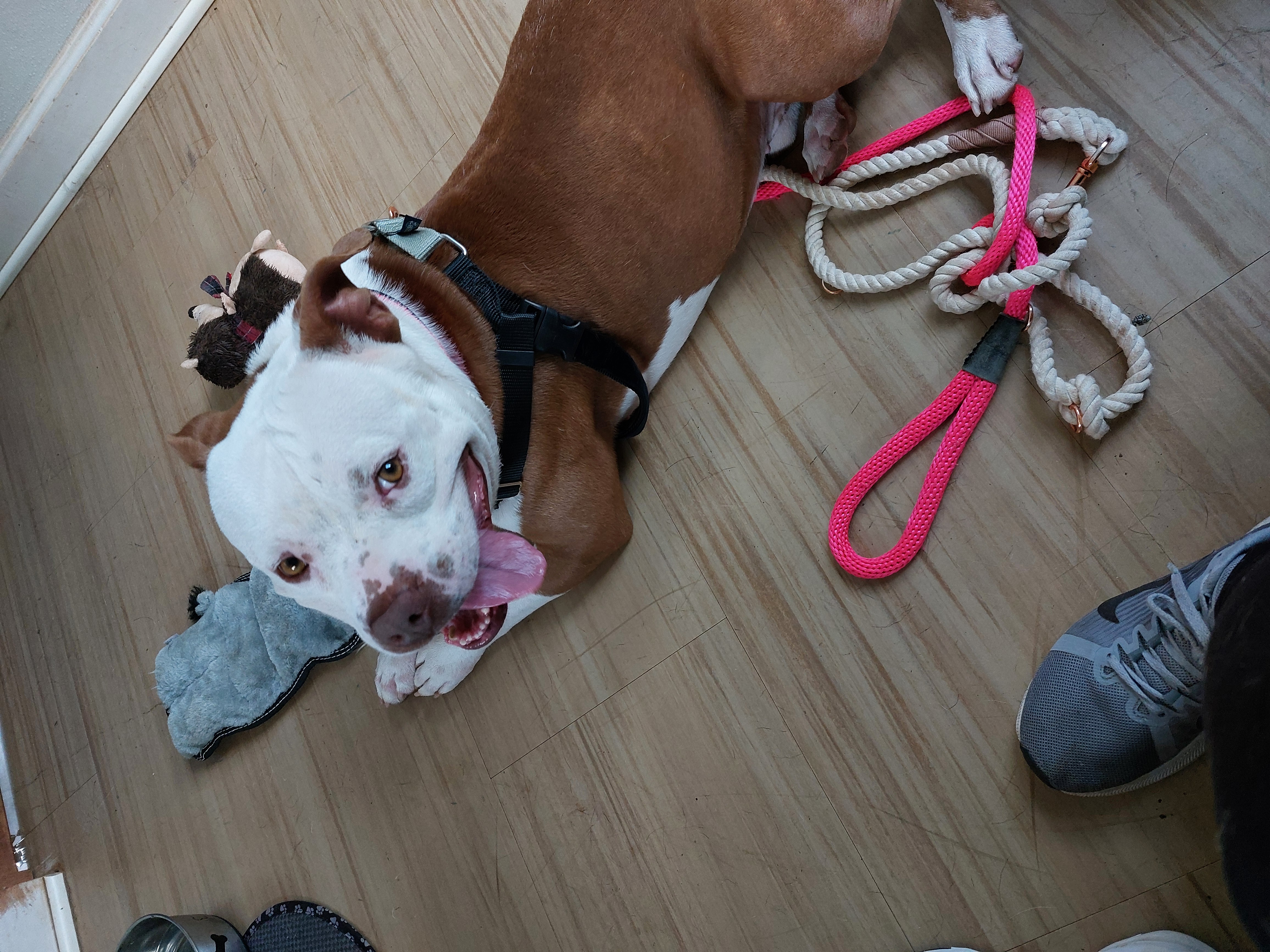 Deebo is a silly but often chill cuddle bug who loves soft toys, scritches on his sides, and lounging in the sun like a piglet on vacation.