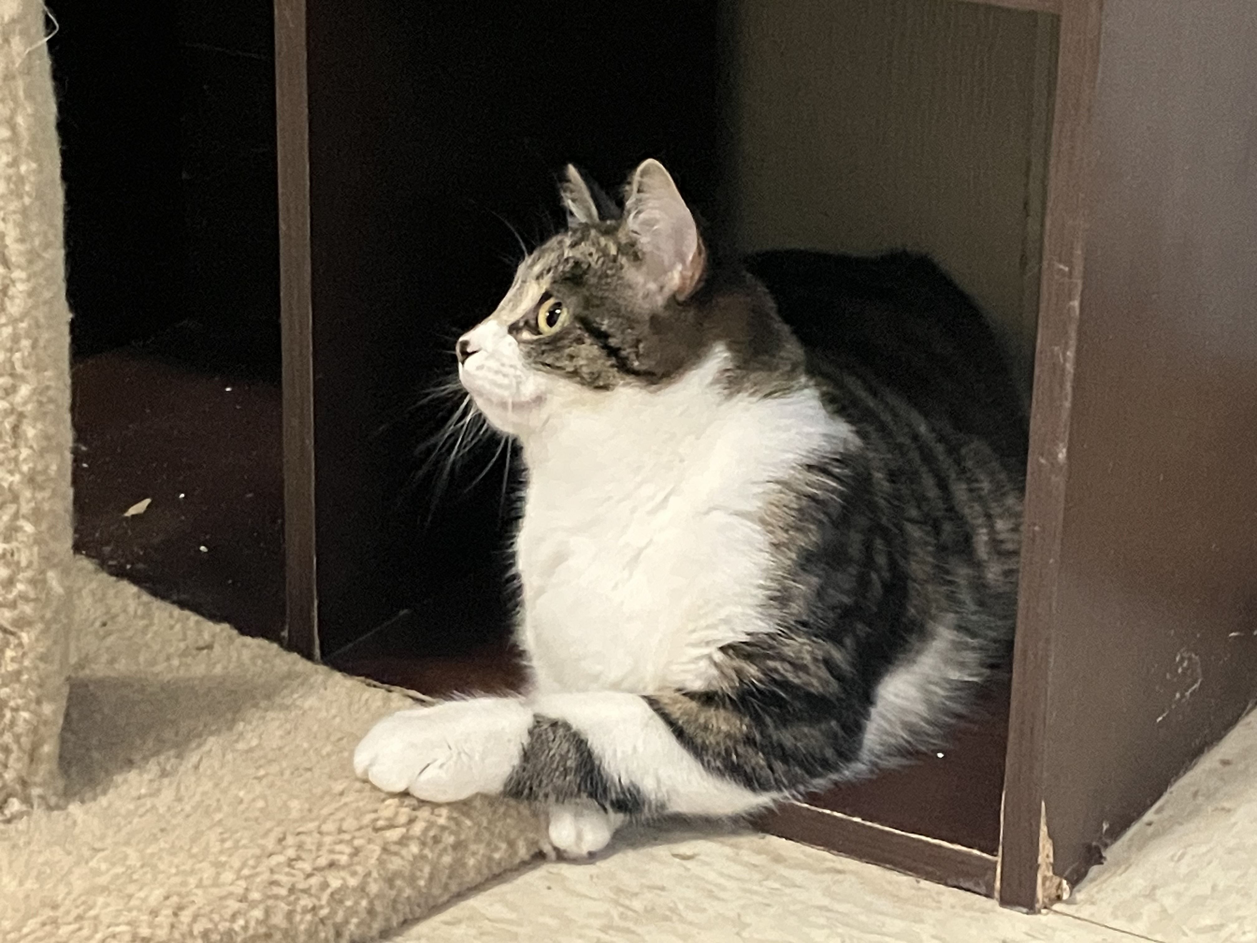 Good with other cats! I’ve lived with them before and enjoy their company. If you have another cat, I will go home as foster with intent to adopt so you can see how things go and make sure it’s a magically perfect match!