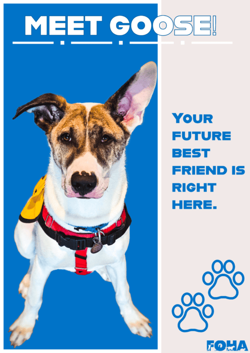 Goose is a joyful, energetic young dog with a playful personality that lights up any room. He’s often described as “bouncy” by FOHA staff because of his long legs, big feet, and boundless enthusiasm for zoomies. Goose is friendly with people and other dogs, enjoys walks, playtime, and toys of all kinds, and responds well to positive reinforcement and redirection.