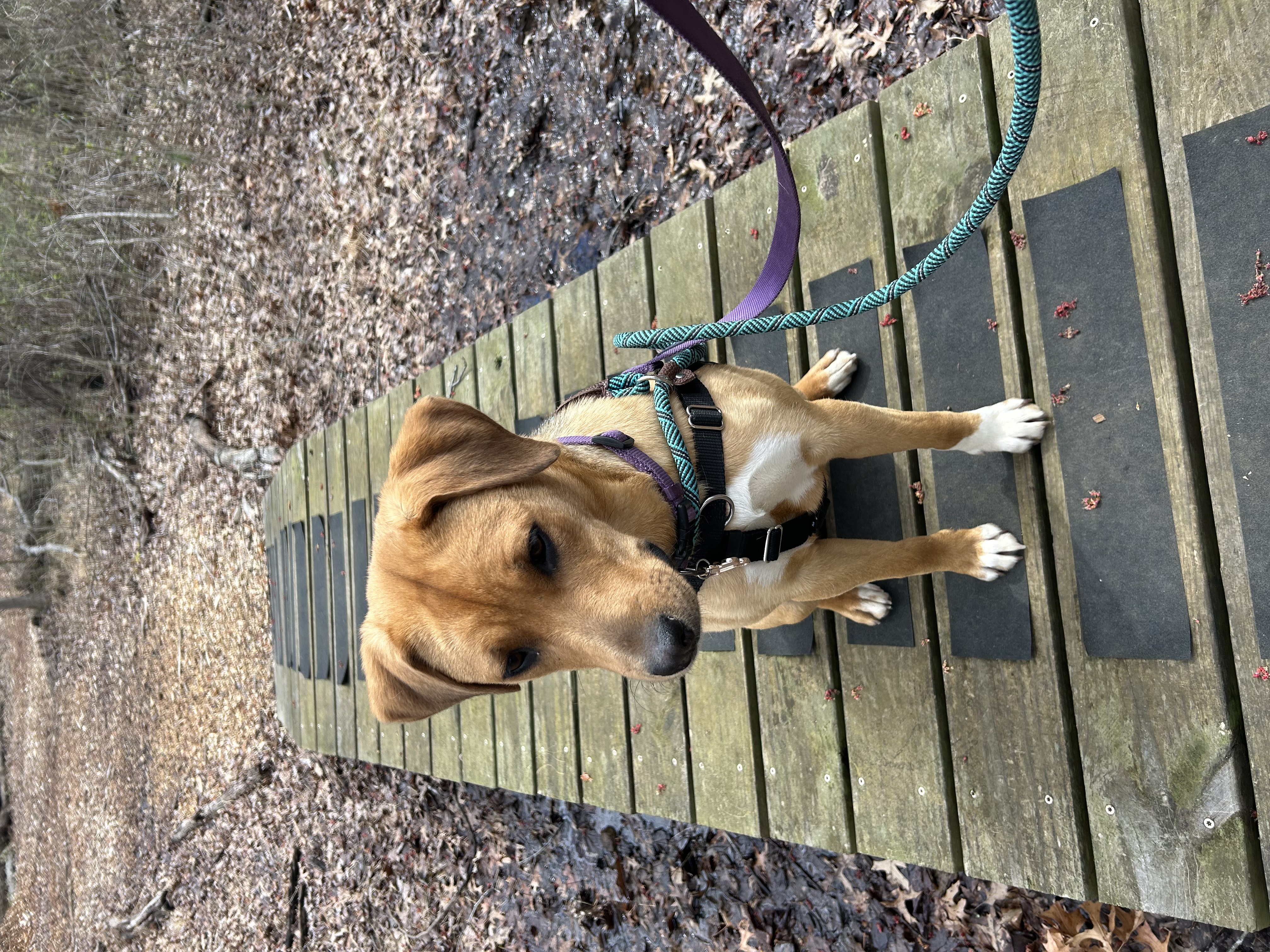 Loose leash walking; confident with guidance and encouragement.