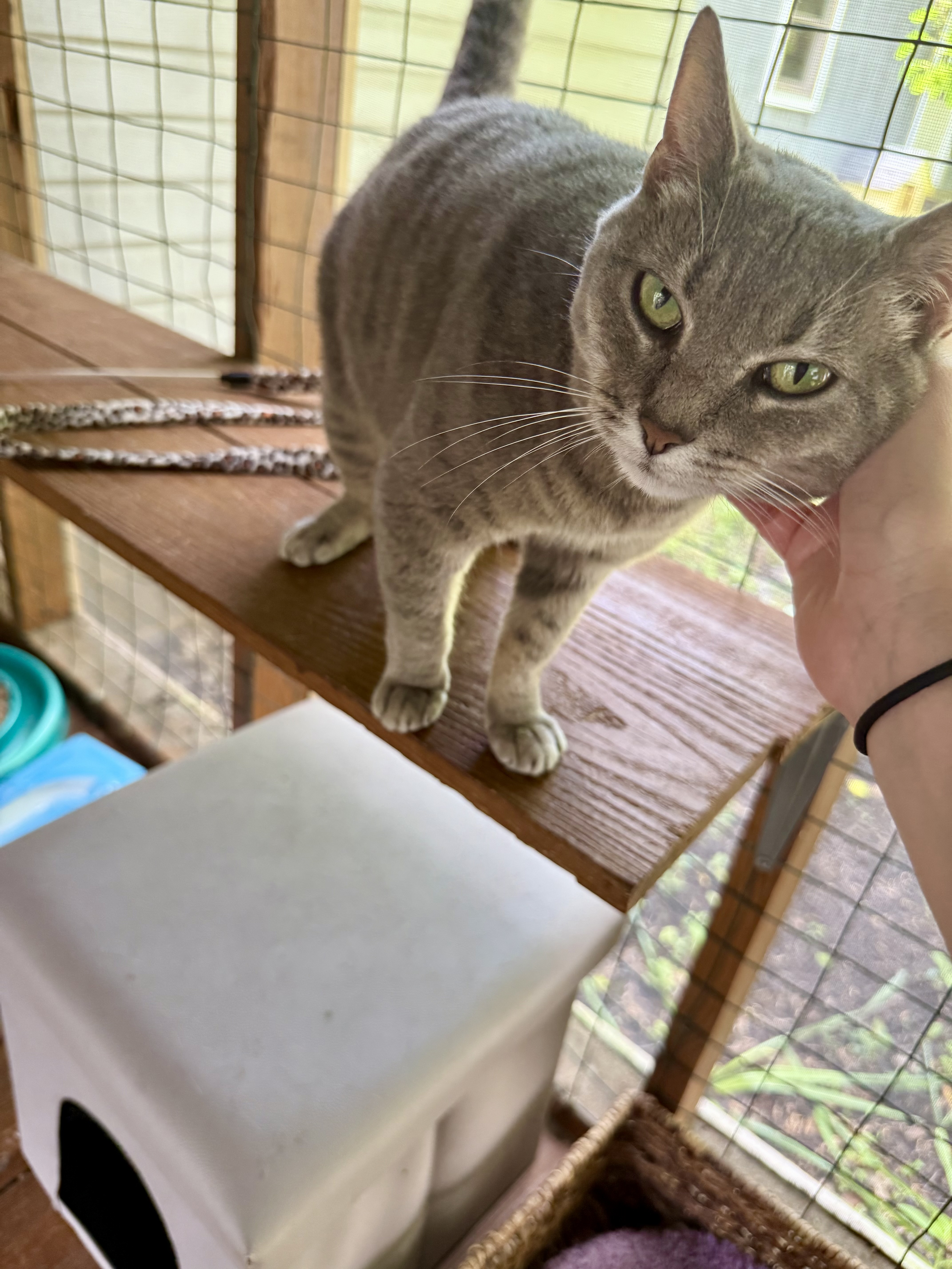 I’m equal parts independent and affectionate. I adore pets, chin scratches, and lounging on my high tower to watch the rain like it’s my own personal romance movie. Offer me a Churu or a wand toy, and I’ll show you my playful side. Give me quiet company, and I’ll happily keep you warm while making the best biscuits this side of Seattle Grace.