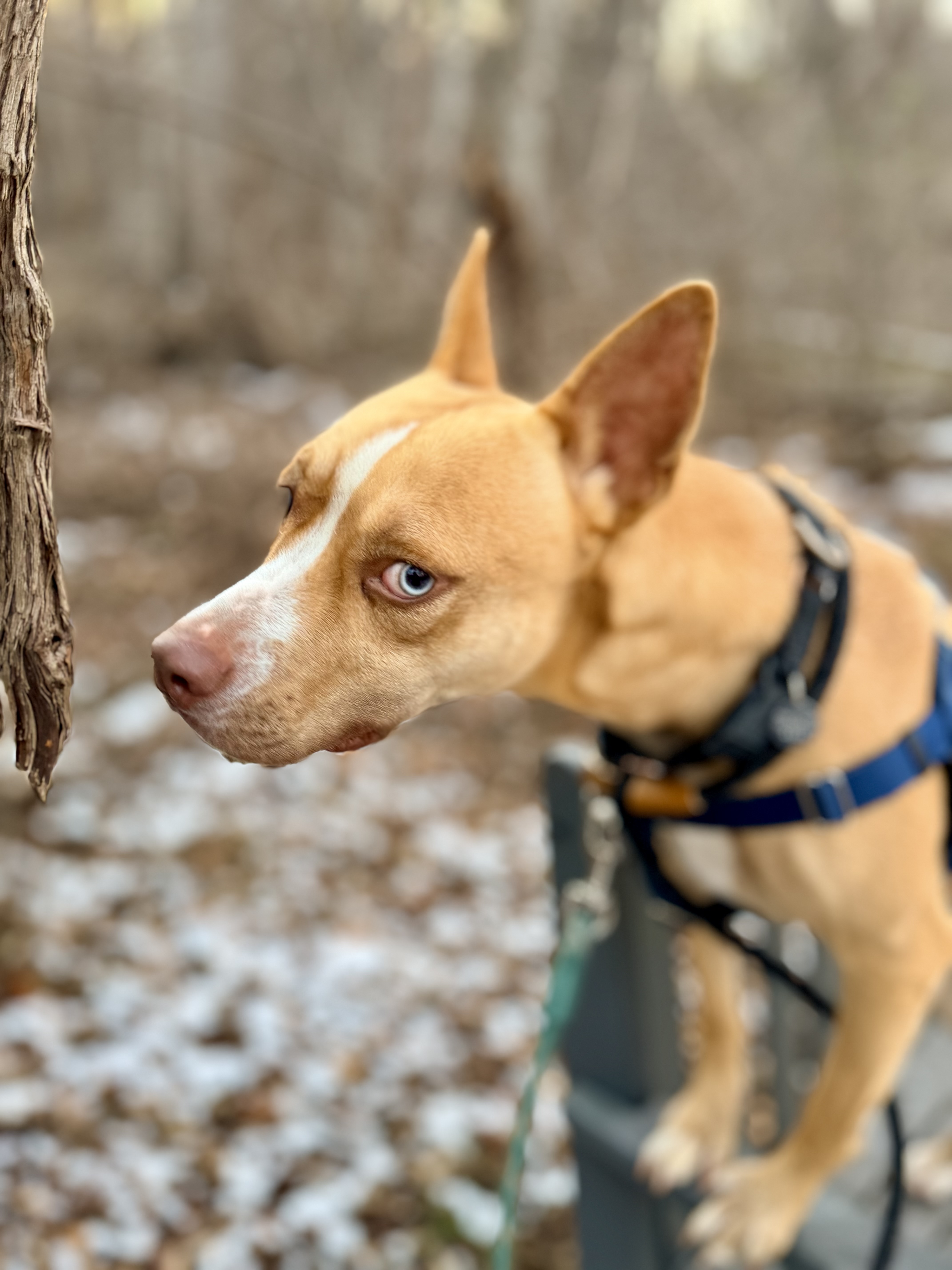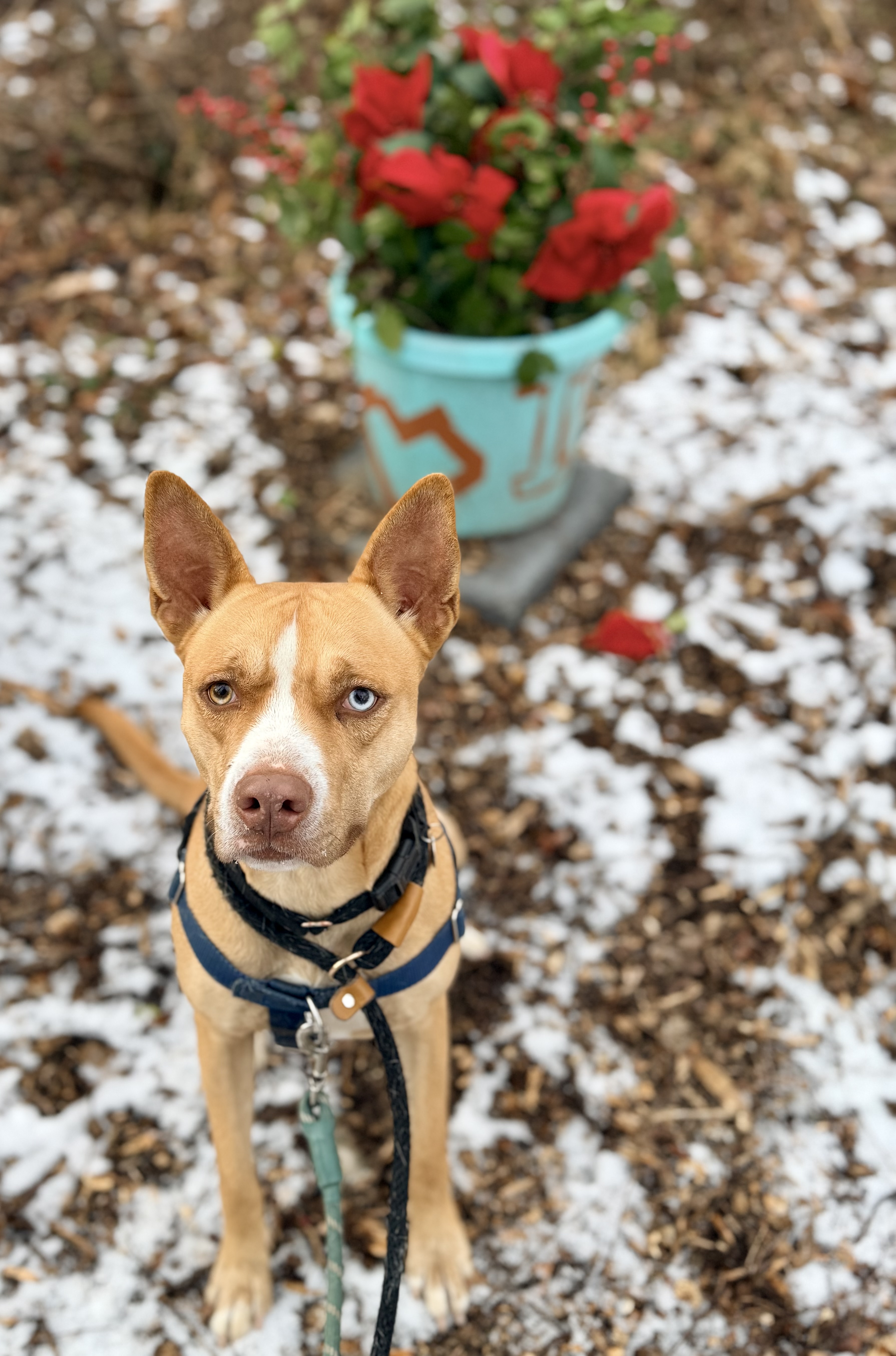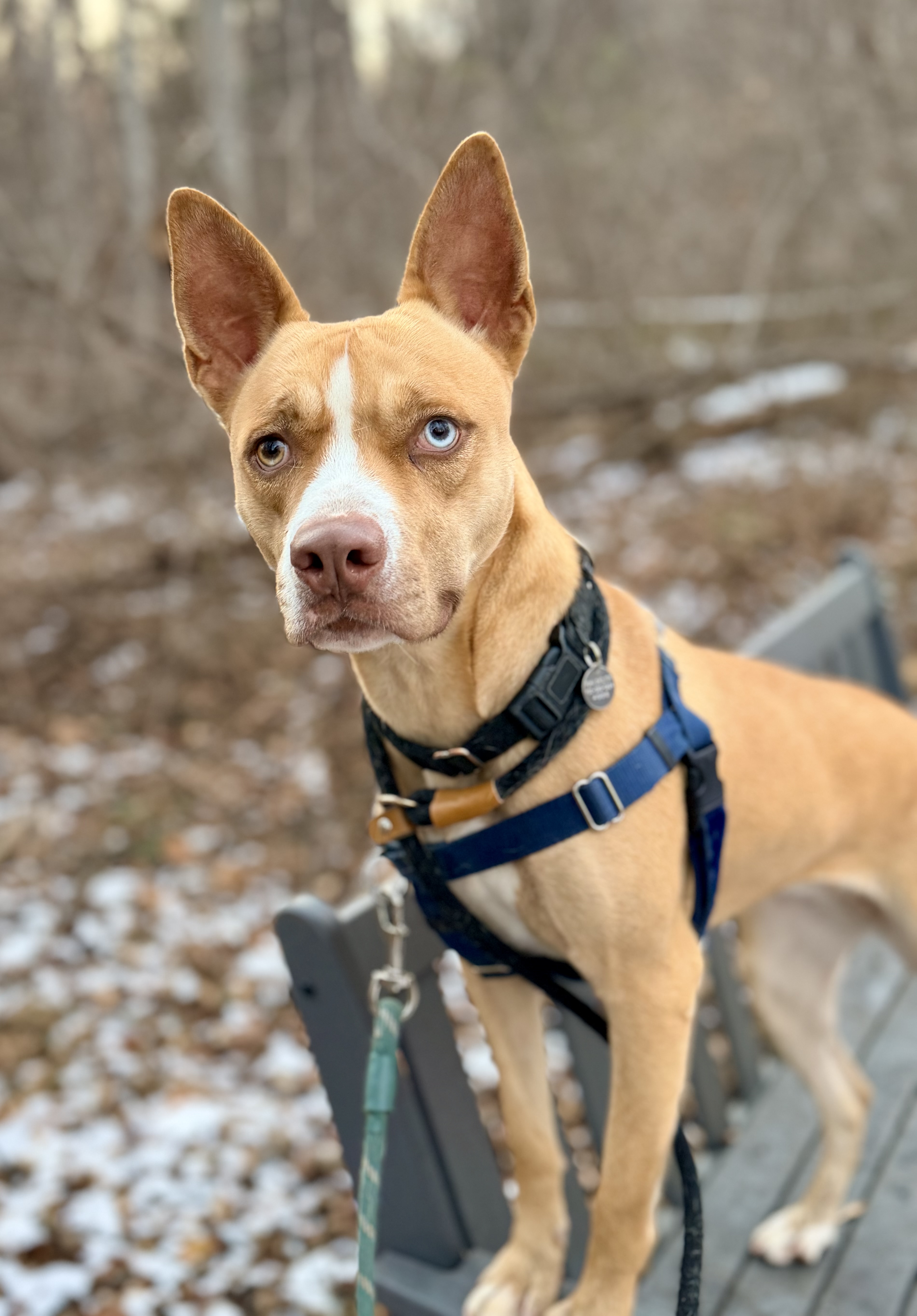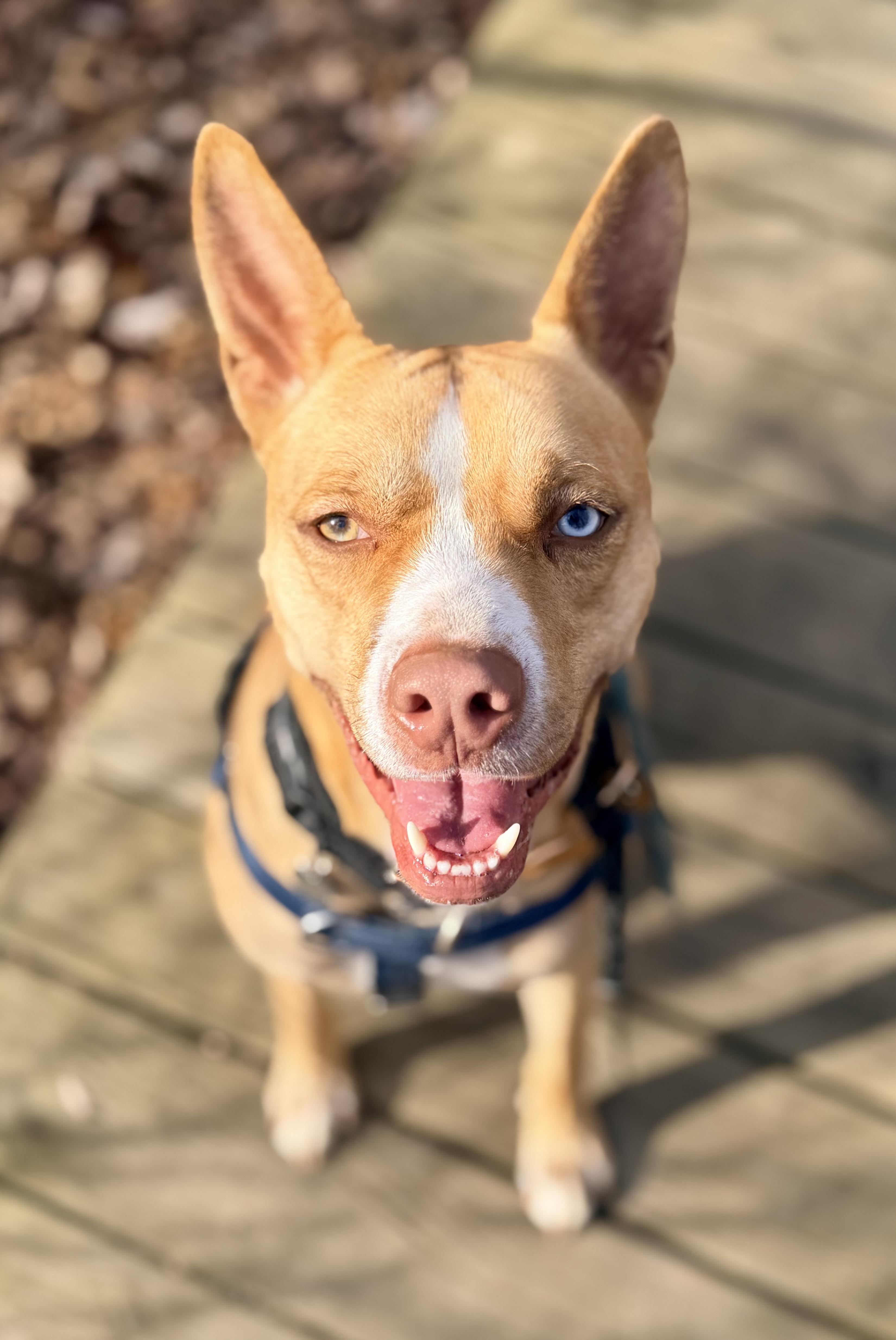 Sally likes to lay her front half on your lap and lean in for belly rubs. She knows sit, down, come, look, and touch, and is learning drop. She enjoys hikes, playing fetch, and agility. She’s comfortable in the car and rides quietly. In the home, she signals at the door to go potty and settles down to chew on a bone. She is calm for grooming and baths. Sally is a 44lb mixed breed with striking blue and gold eyes and is part of FOHA’s Diamond Dog program, which provides extra training and support after adoption.