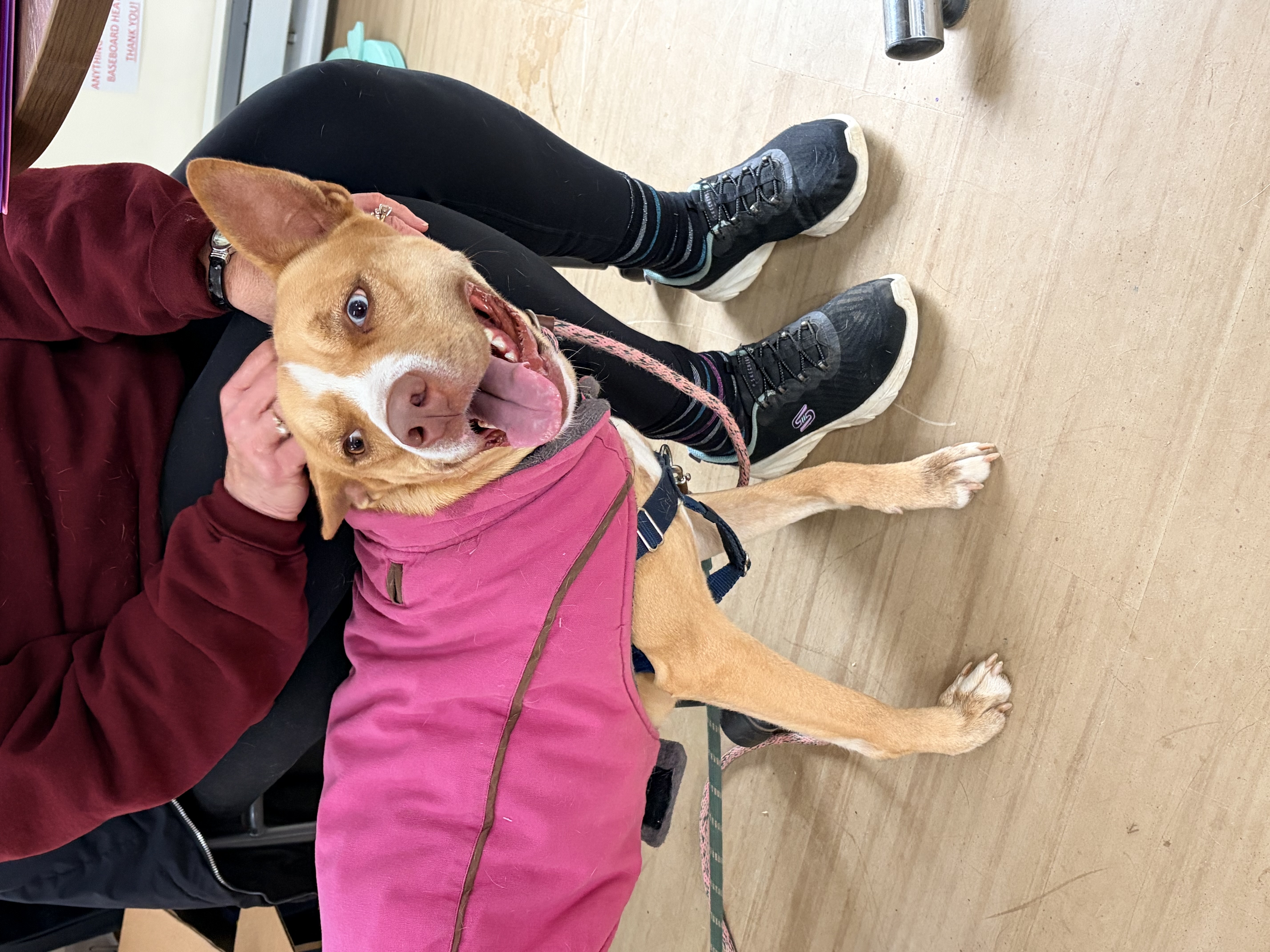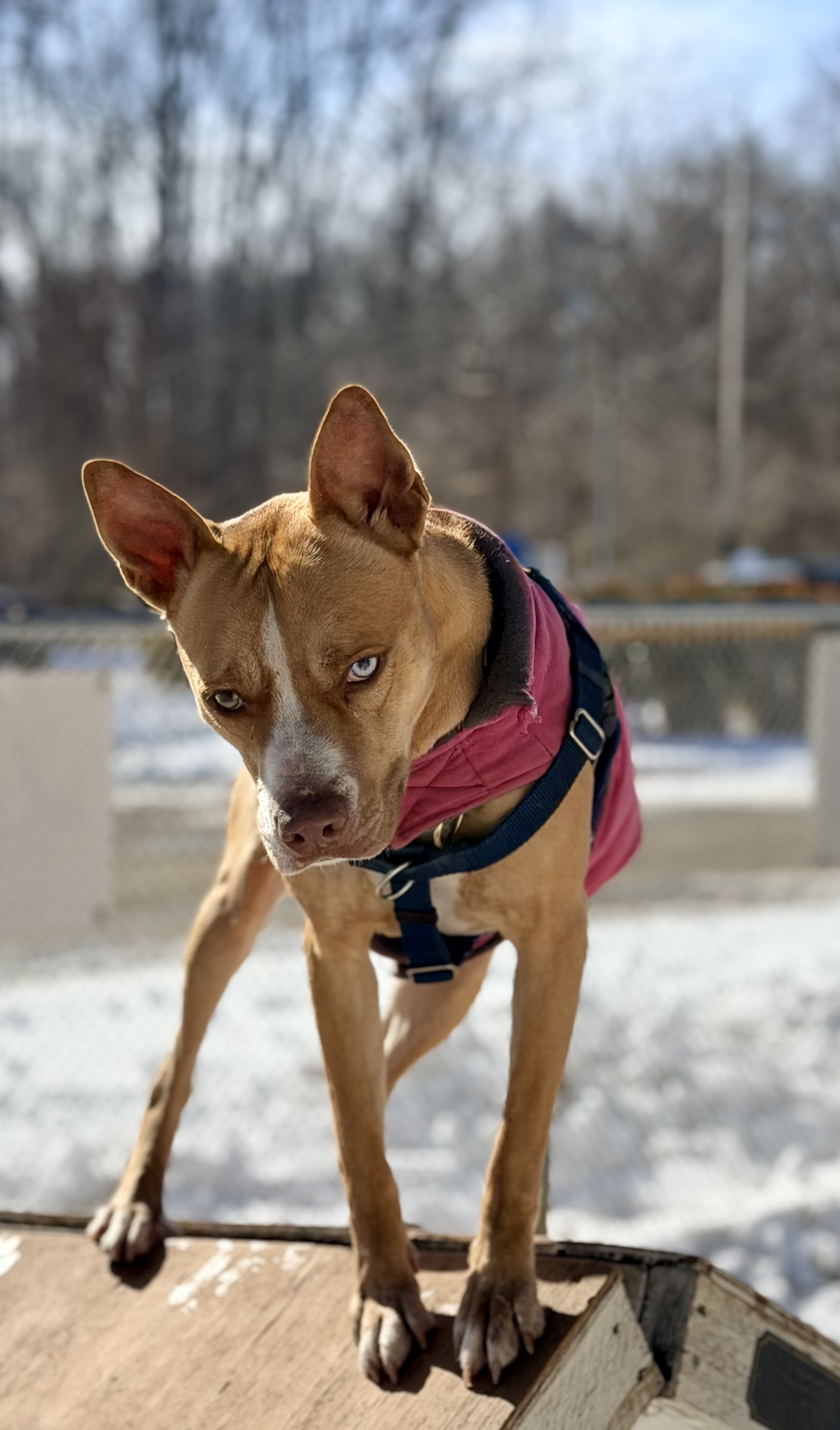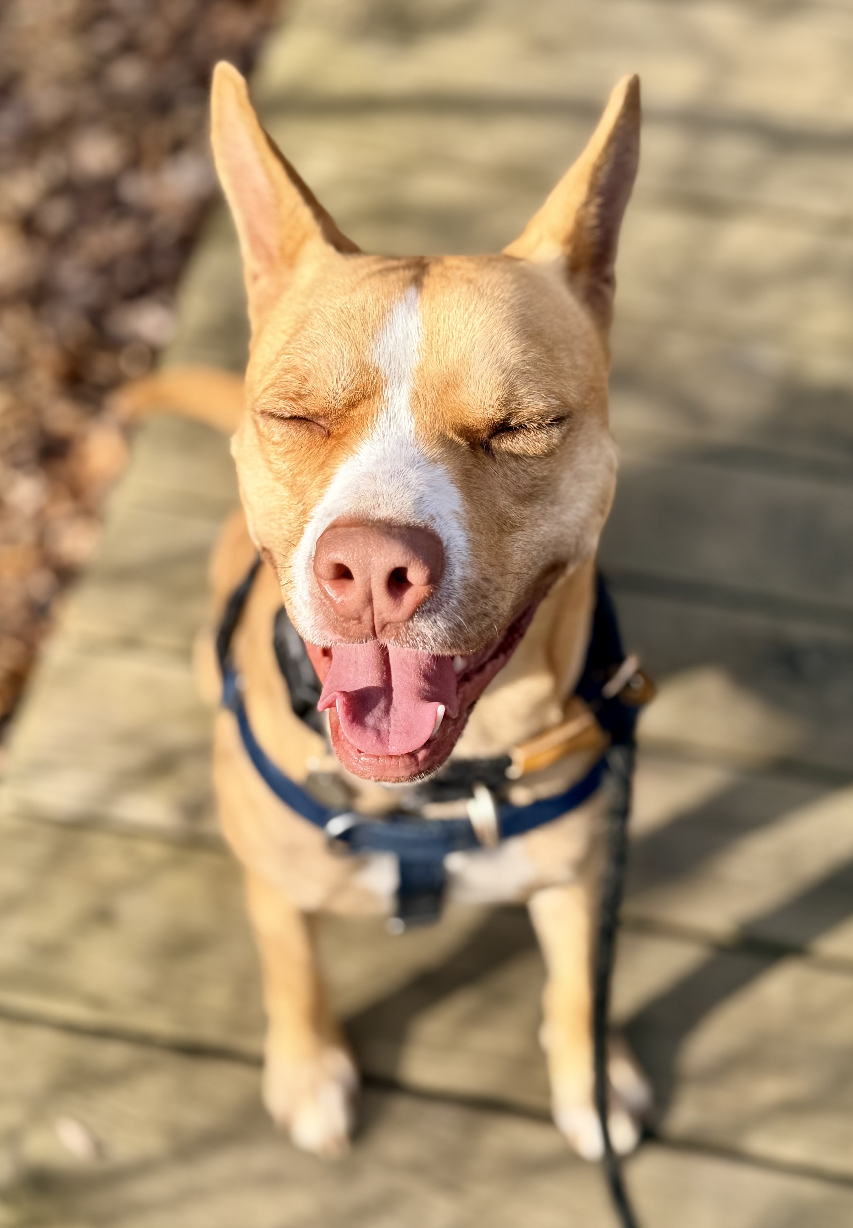 Sally likes to lay her front half on your lap and lean in for belly rubs. She knows sit, down, come, look, and touch, and is learning drop. She enjoys hikes, playing fetch, and agility. She’s comfortable in the car and rides quietly. In the home, she signals at the door to go potty and settles down to chew on a bone. She is calm for grooming and baths. Sally is a 44lb mixed breed with striking blue and gold eyes and is part of FOHA’s Diamond Dog program, which provides extra training and support after adoption.