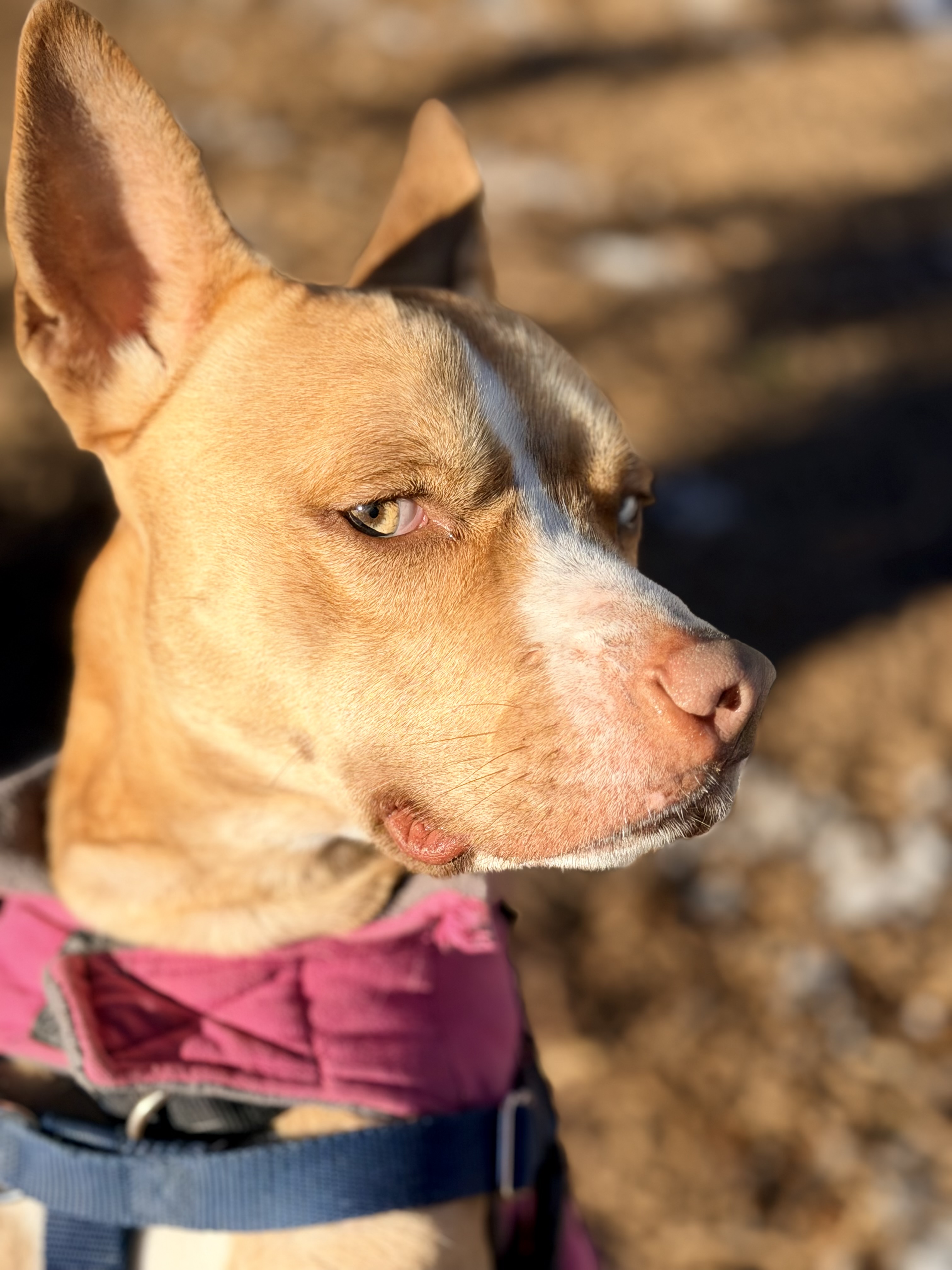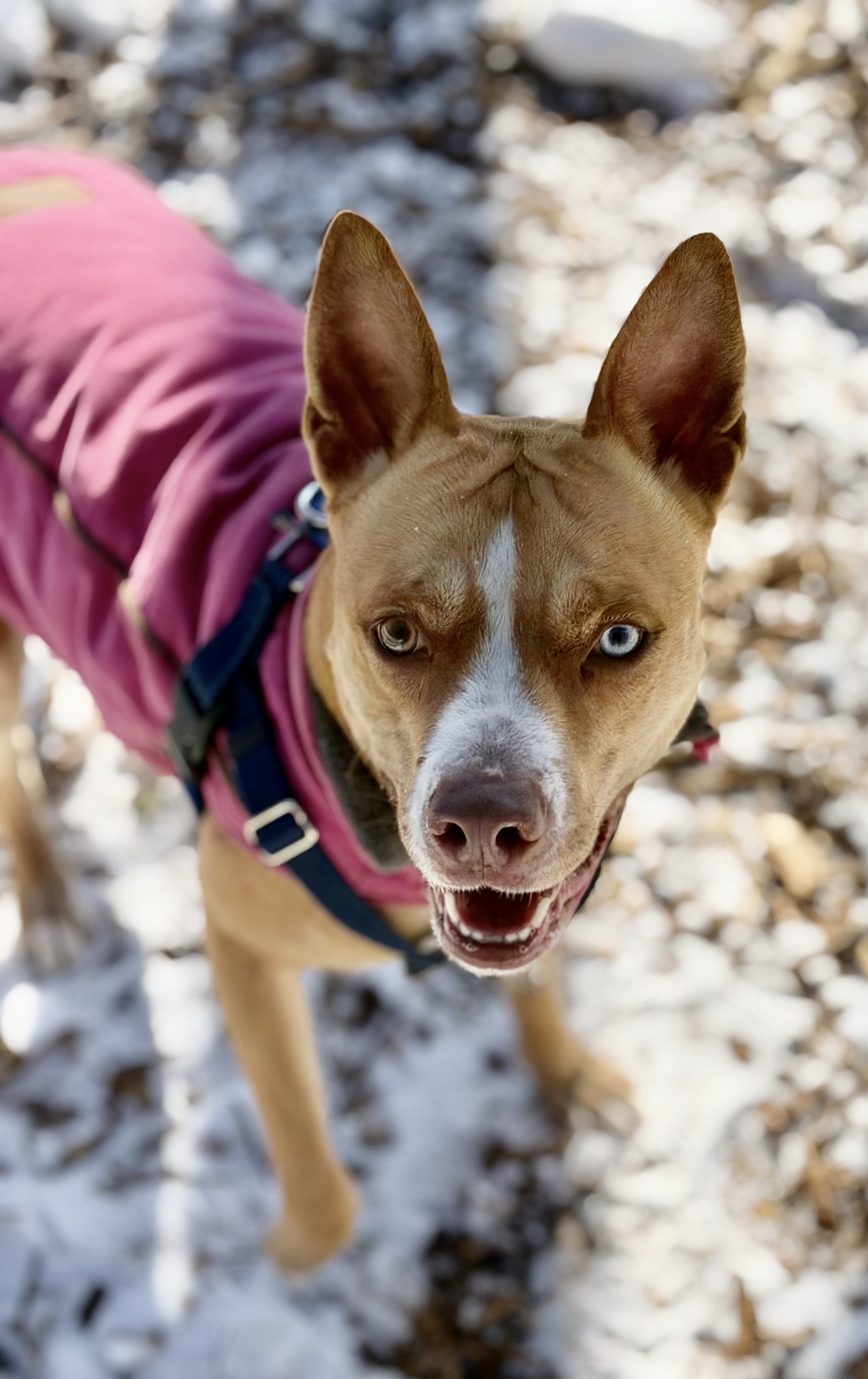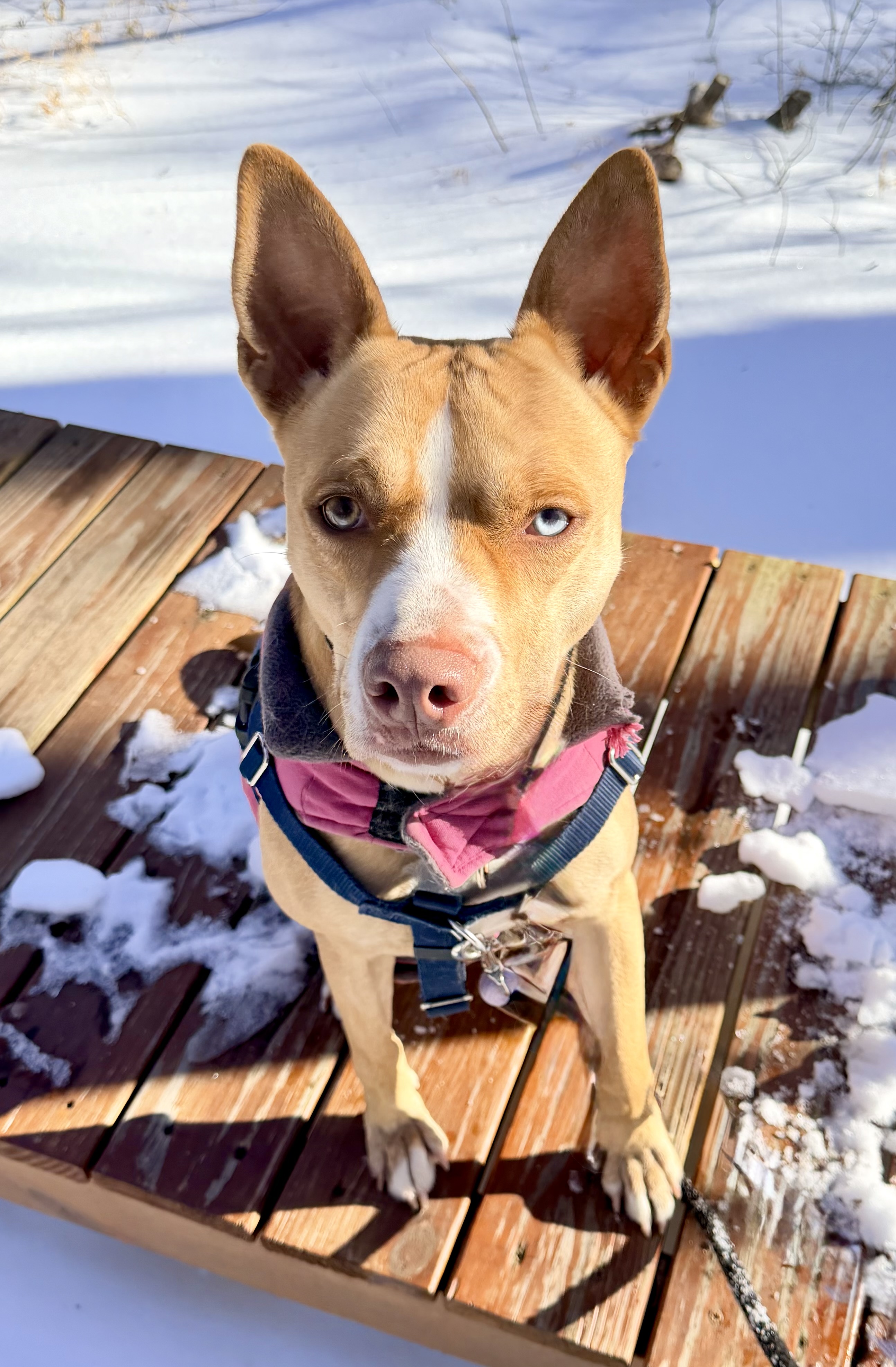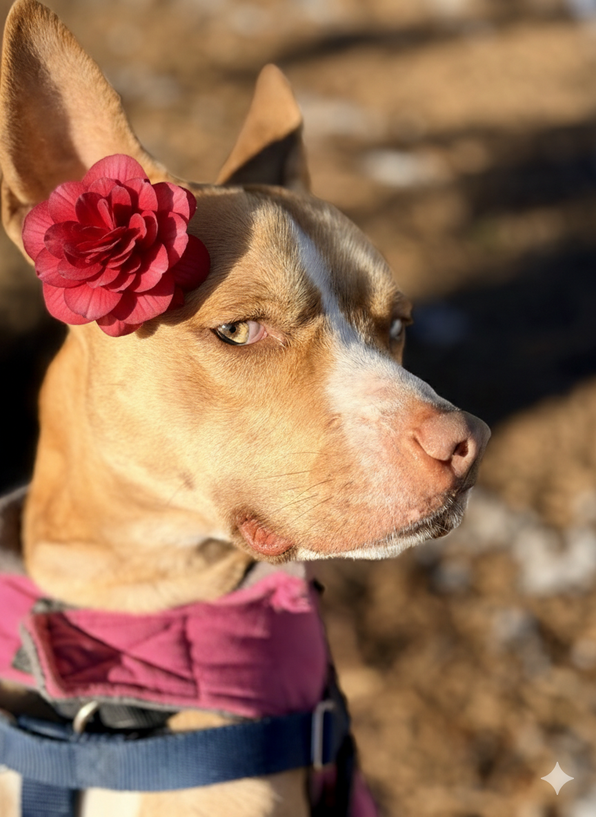 Sally likes to lay her front half on your lap and lean in for belly rubs. She knows sit, down, come, look, and touch, and is learning drop. She enjoys hikes, playing fetch, and agility. She’s comfortable in the car and rides quietly. In the home, she signals at the door to go potty and settles down to chew on a bone. She is calm for grooming and baths. Sally is a 44lb mixed breed with striking blue and gold eyes and is part of FOHA’s Diamond Dog program, which provides extra training and support after adoption.