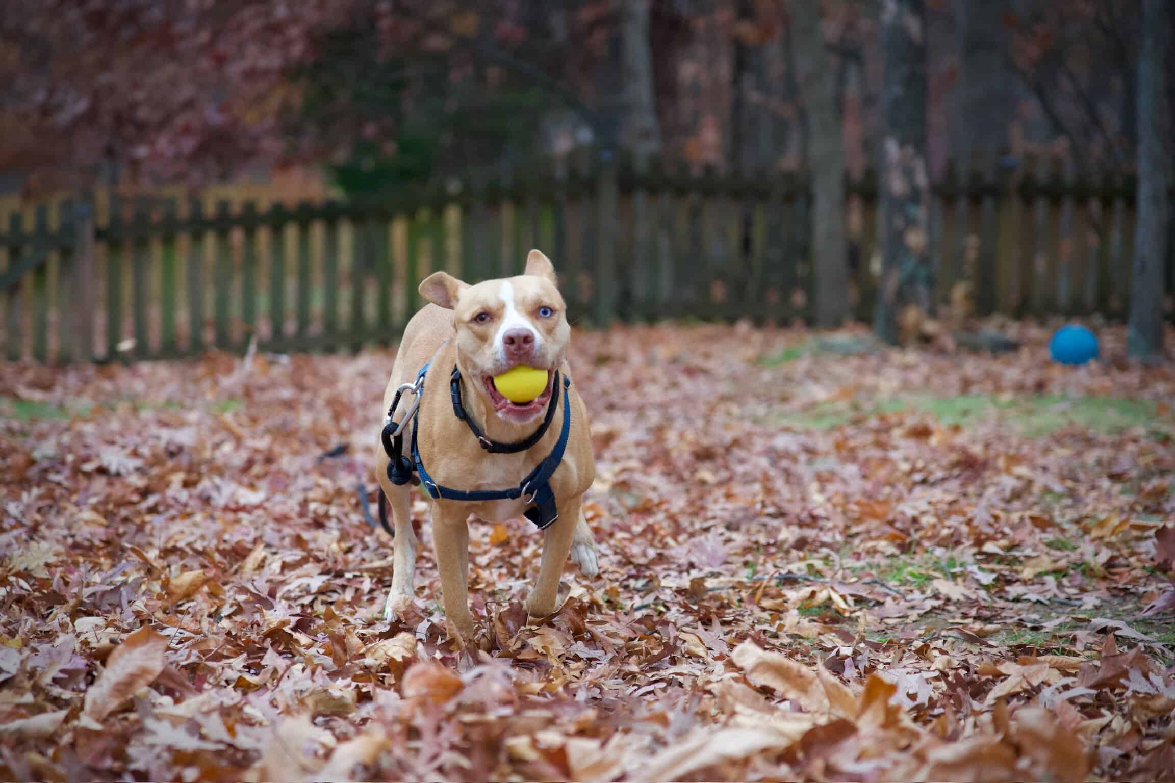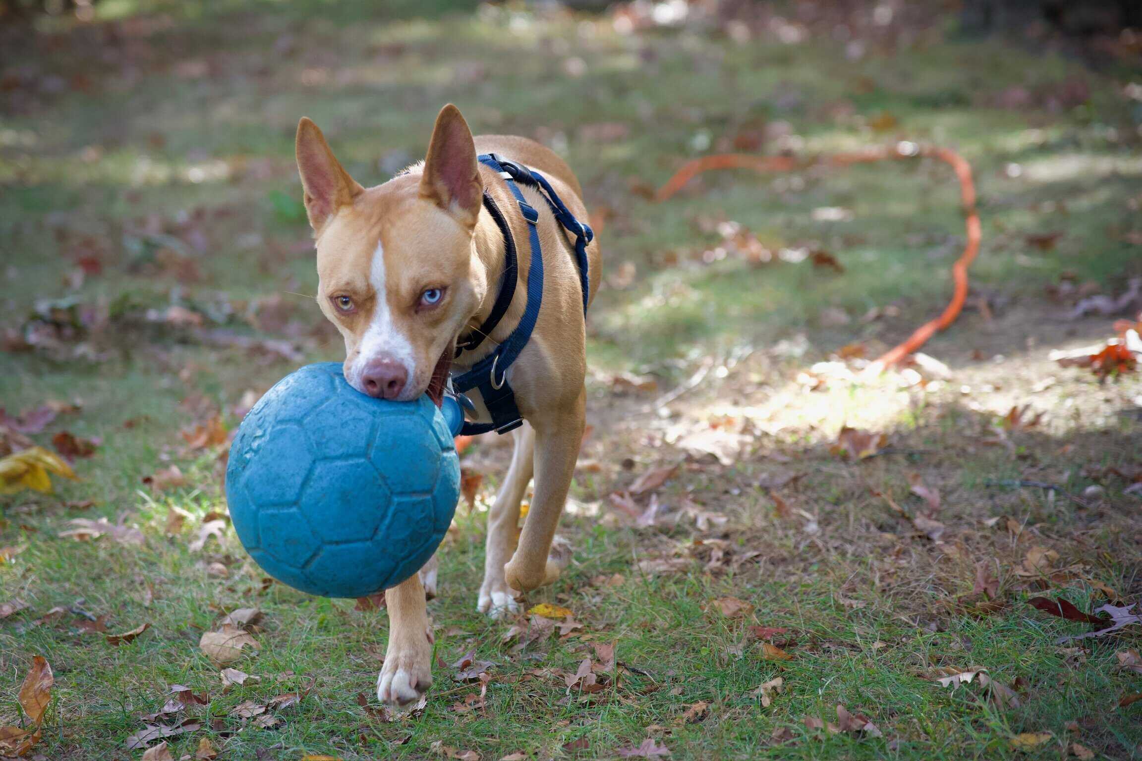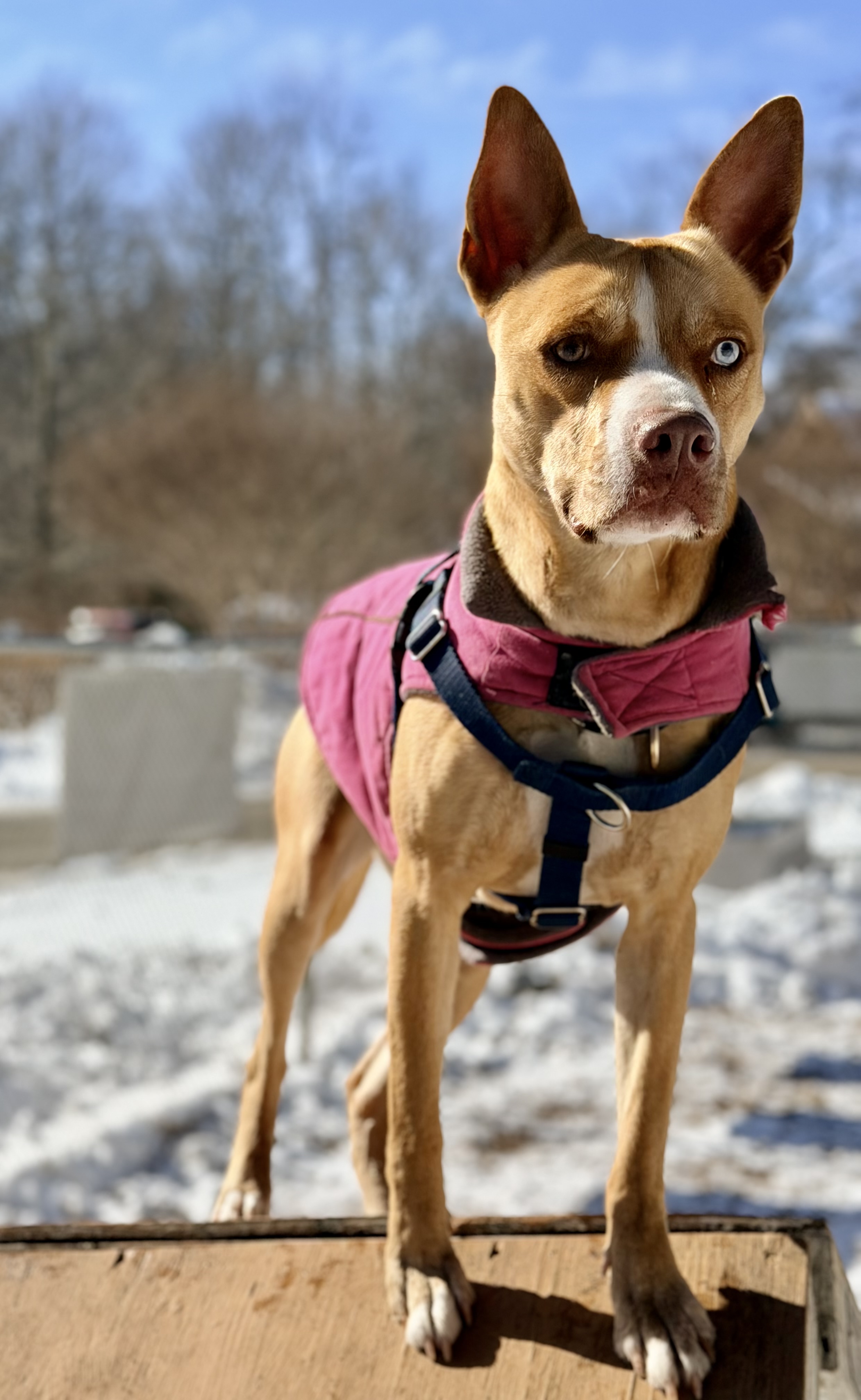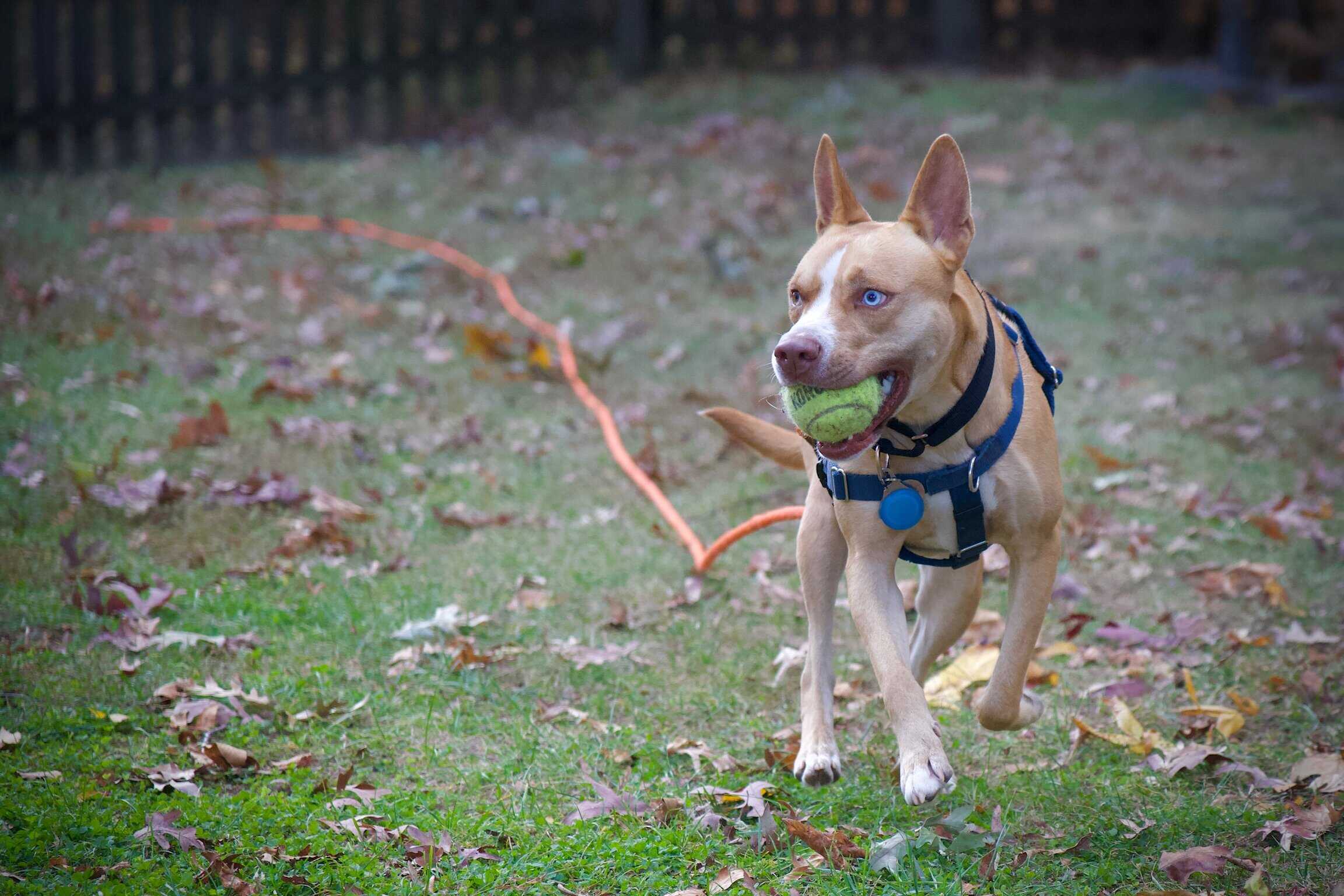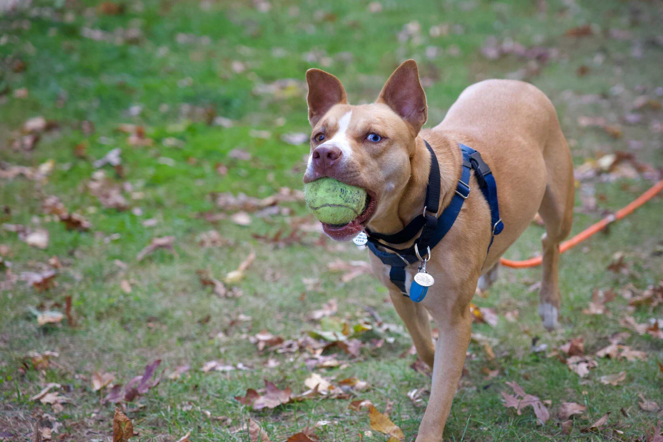 Sally likes hiking, playing fetch (she brings the ball back each time), splashing in a pool, and running through the leaves. She’s been comfortable learning agility, including the A-frame, elevated walk, and weave poles. She likes to rest on your lap for rubs or chew on a bone. She picks up new commands quickly and enjoys training.