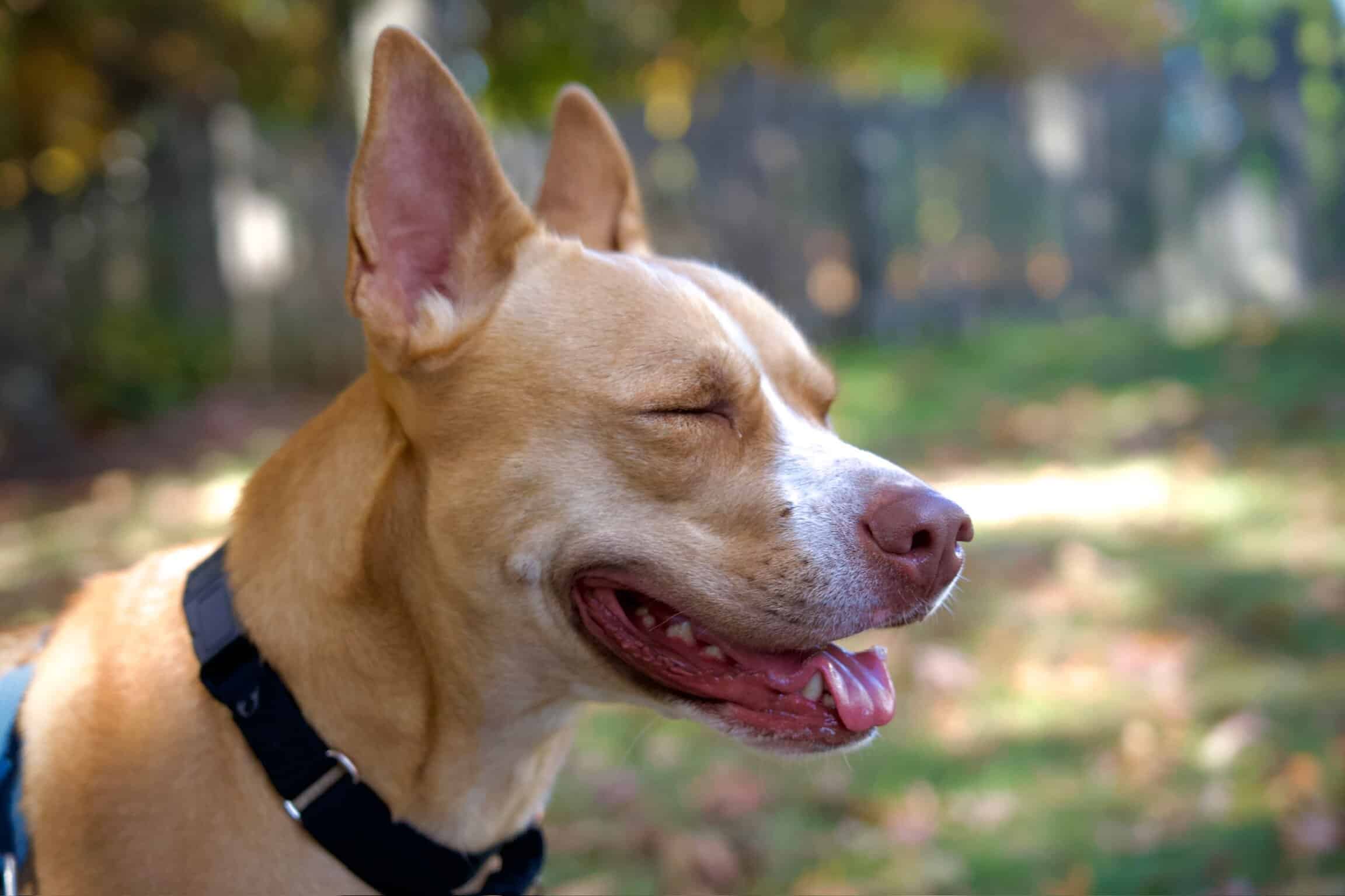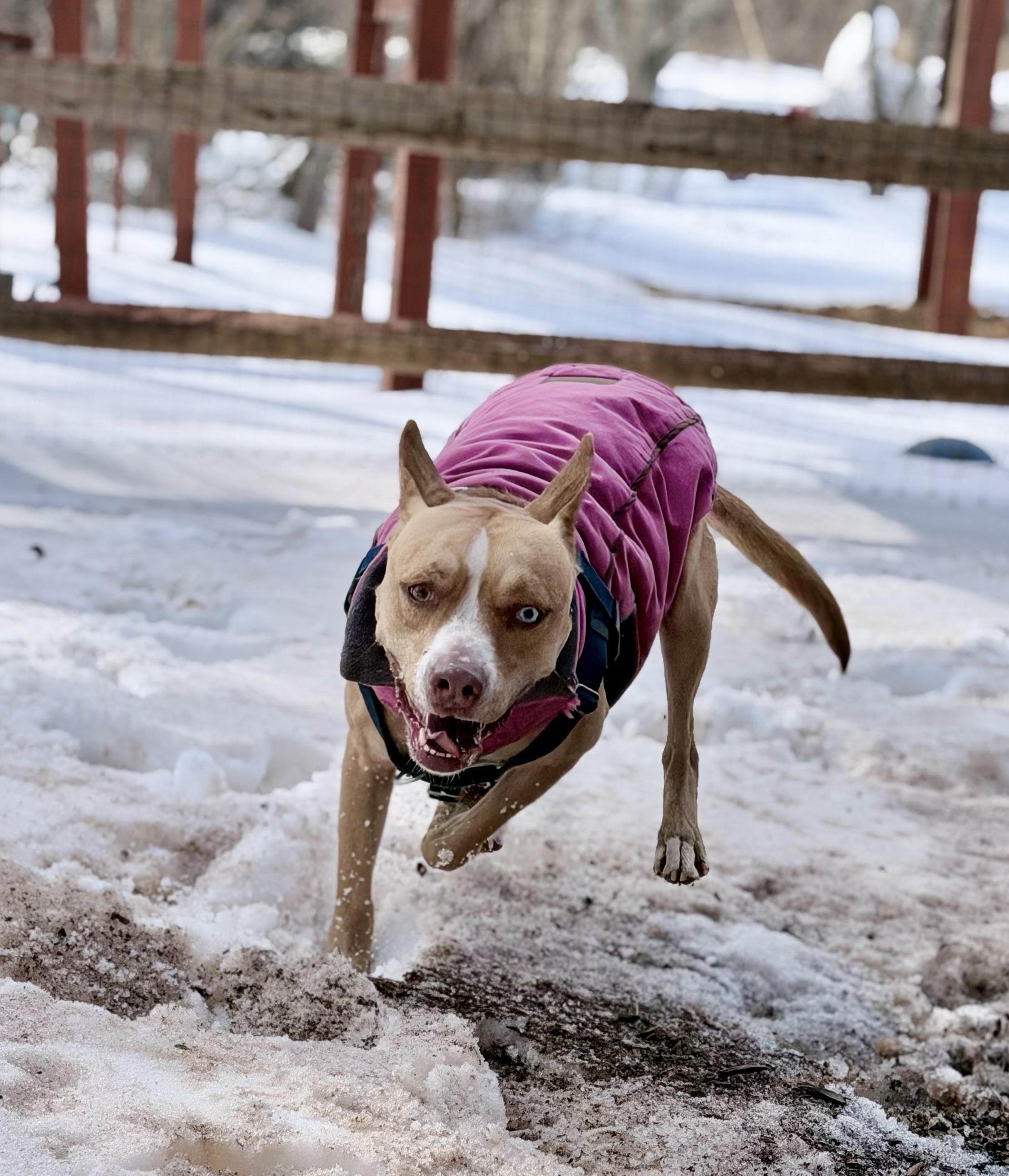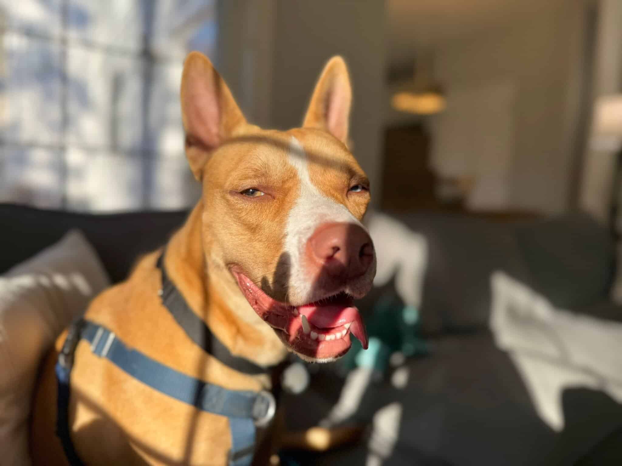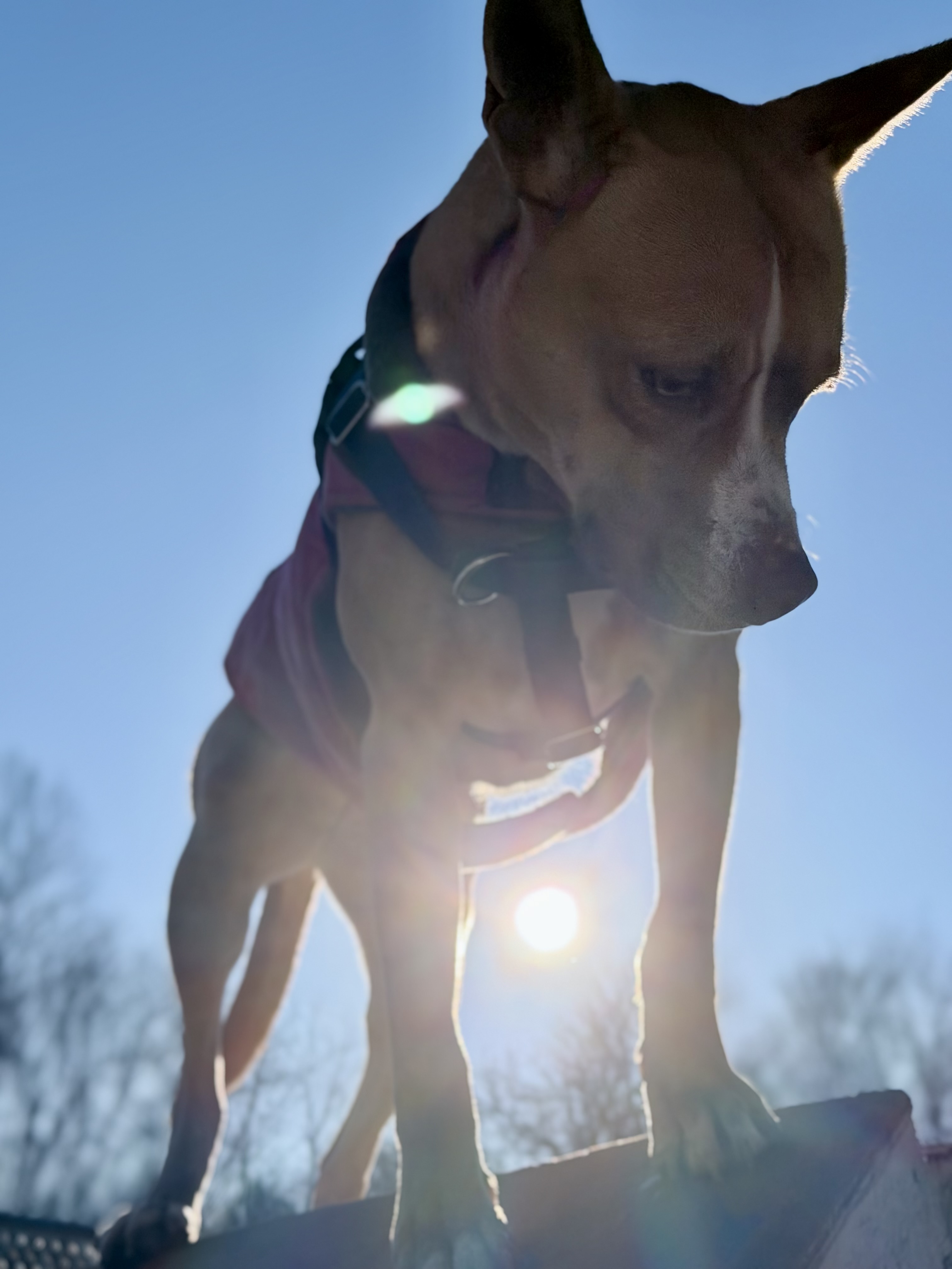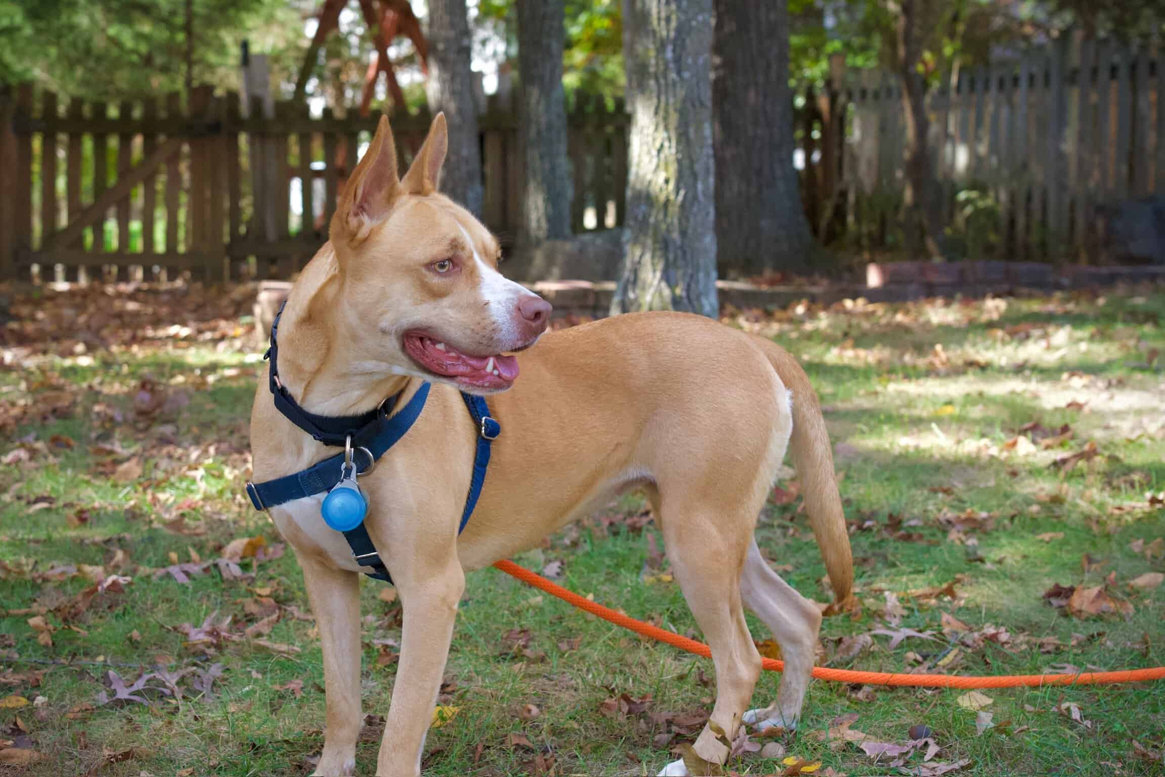 Sally likes hiking, playing fetch (she brings the ball back each time), splashing in a pool, and running through the leaves. She’s been comfortable learning agility, including the A-frame, elevated walk, and weave poles. She likes to rest on your lap for rubs or chew on a bone. She picks up new commands quickly and enjoys training.
