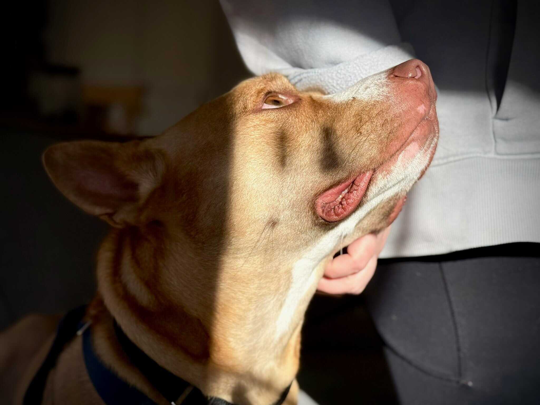 Sally needs time to settle in new environments and can be excitable when meeting new people. She can be a strong puller when excited about something on a walk, a front-clip harness helps with leash walking.